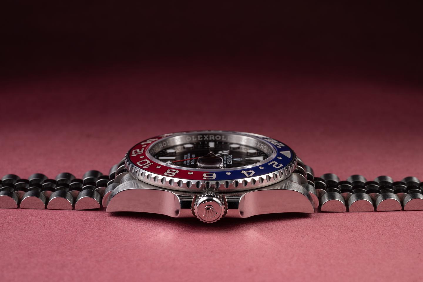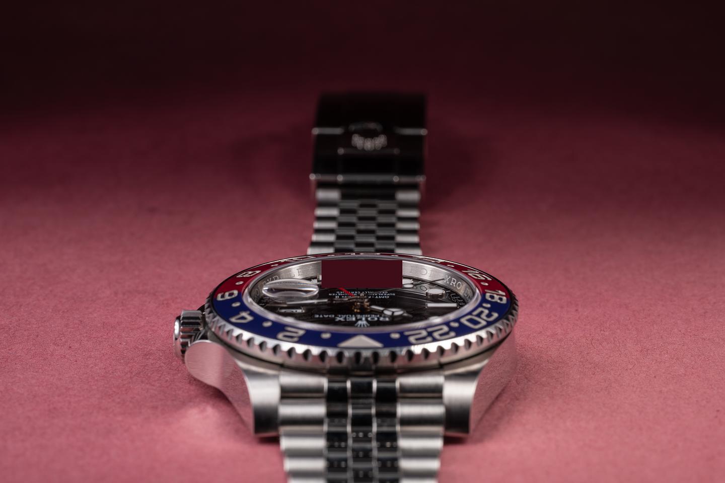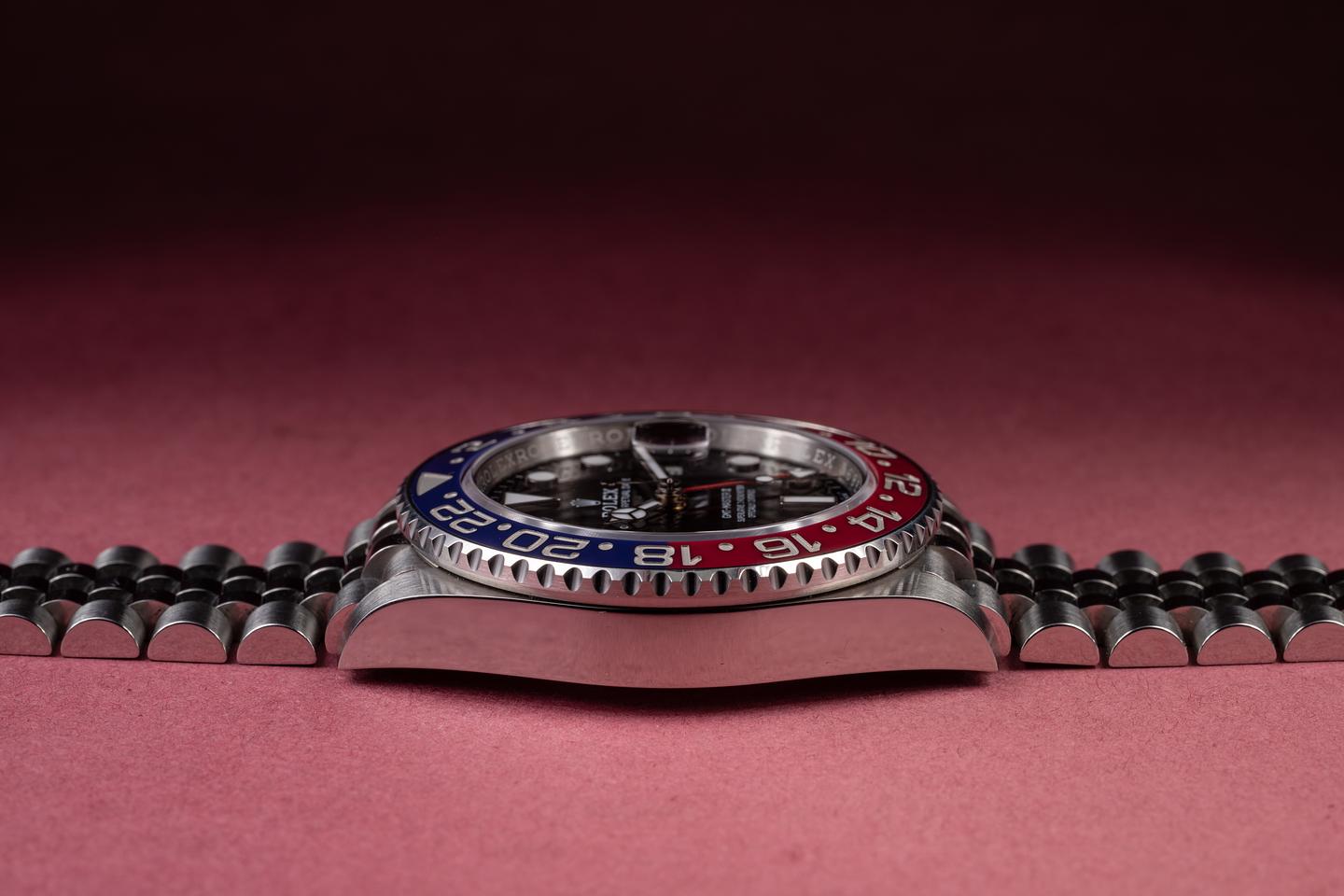 Case: The sharp case is excellent, showing only very light wear from use. The blue and red ceramic bezel is also in excellent condition, showing no visible wear.