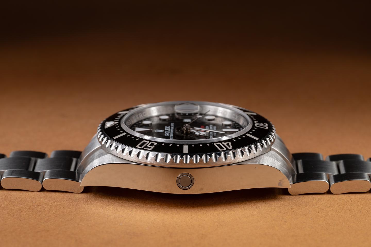 Case: The sharp 43mm case is excellent, showing only very light wear from use. The black ceramic bezel is also in excellent condition, showing no visible wear.
