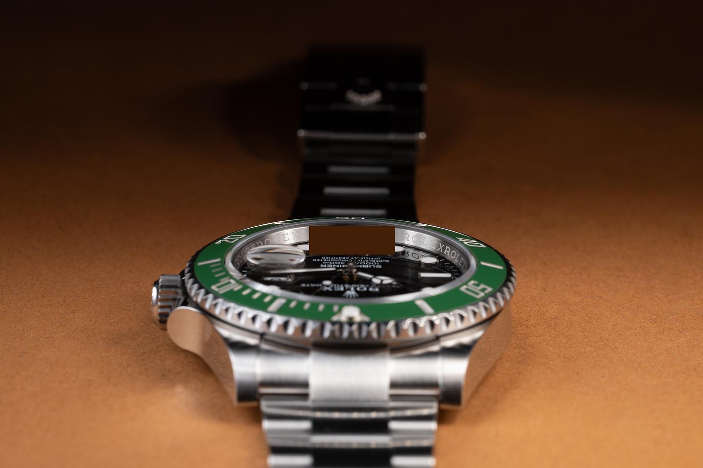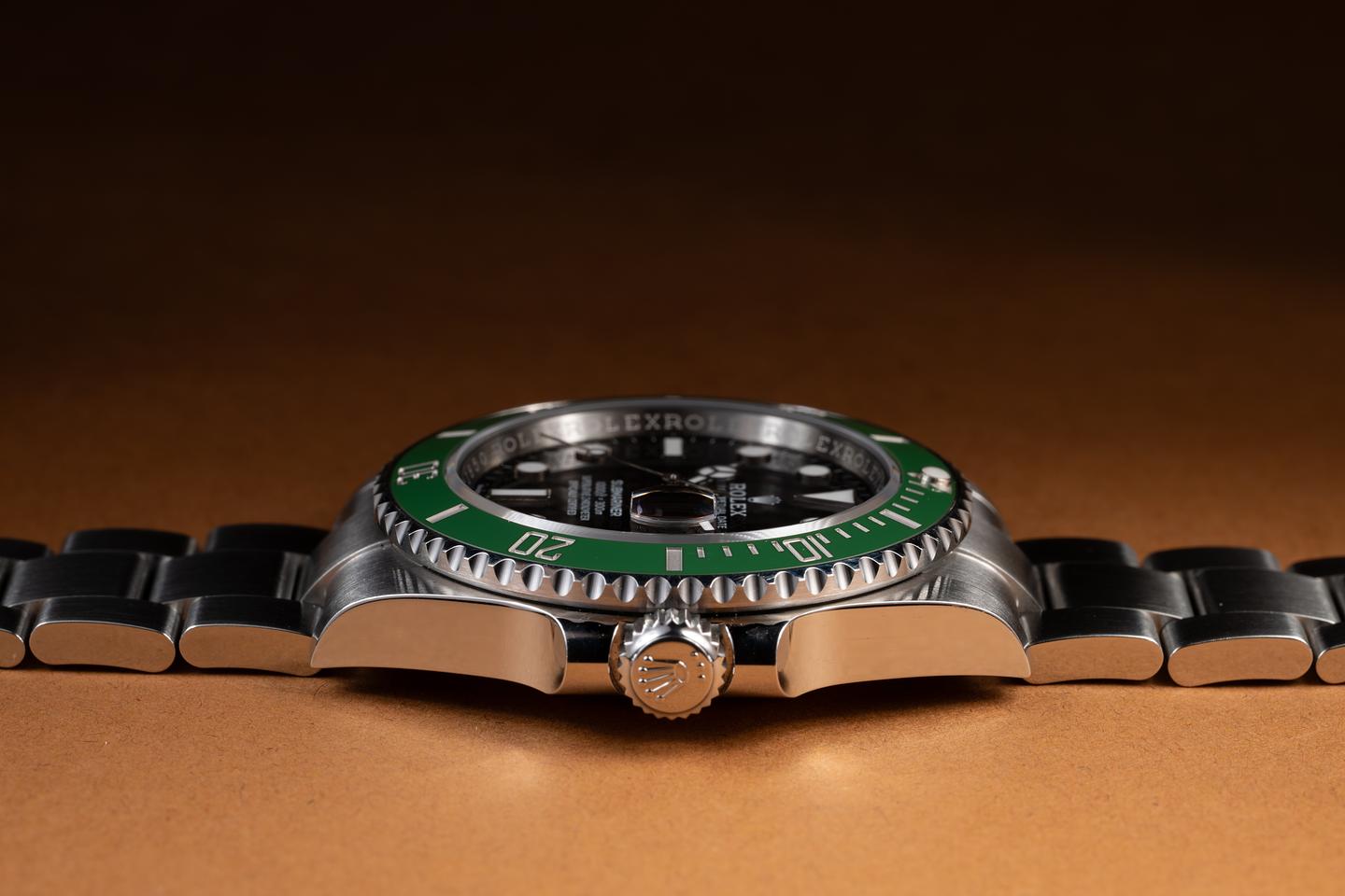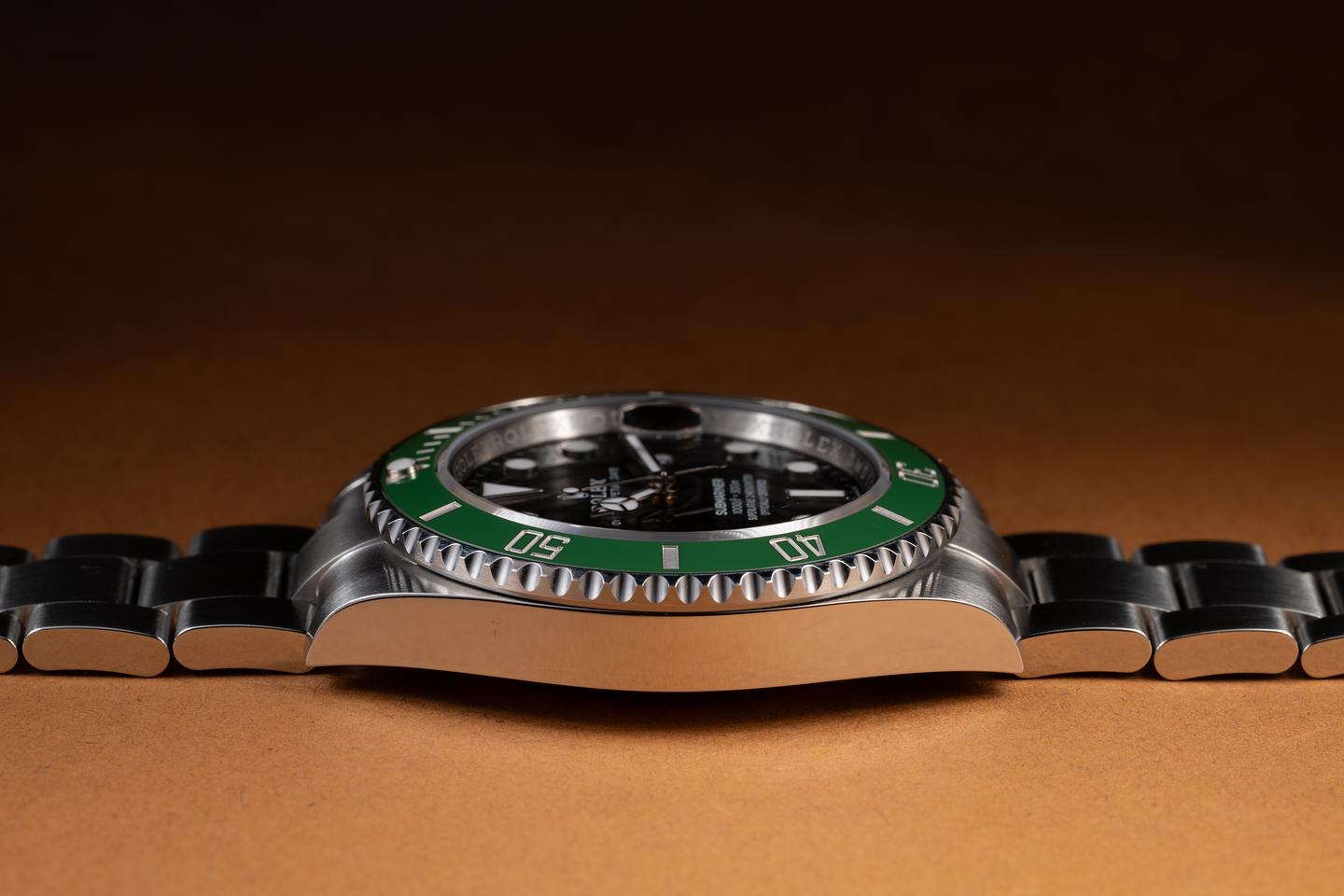 Case: The sharp case is excellent, showing only very light wear from use. The green ceramic bezel is also in excellent condition, showing no visible wear.