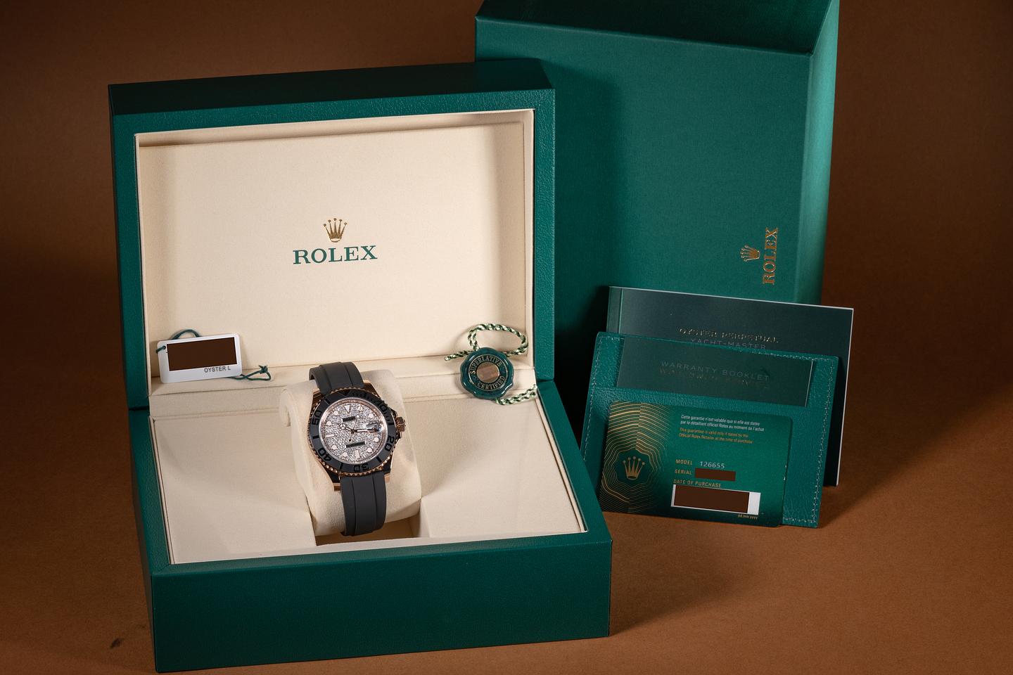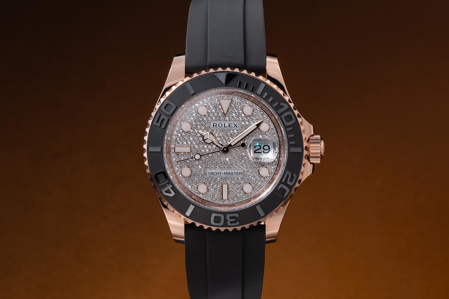 Bracelet: The black robber Rolex strap is excellent, showing little if any wear. The 18K rose gold clasp is in mint, unworn condition.