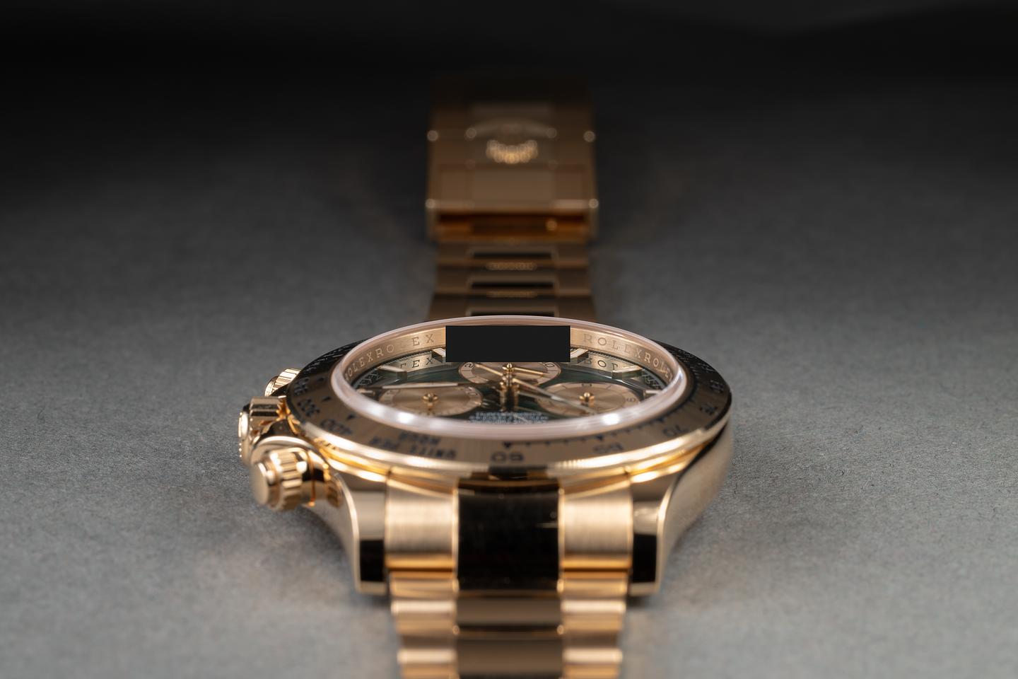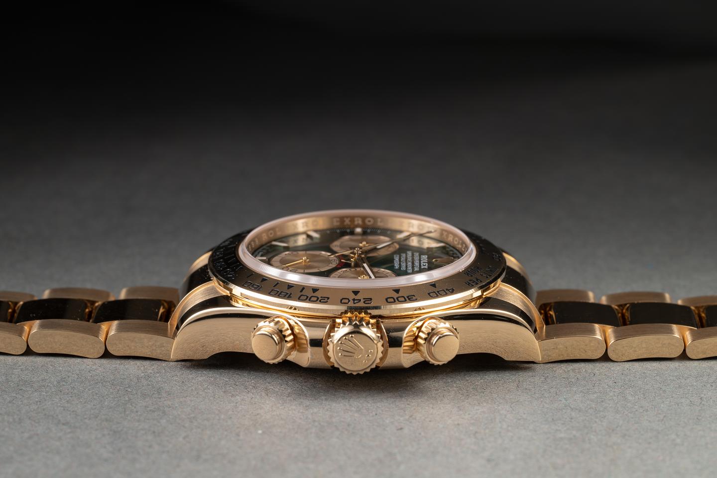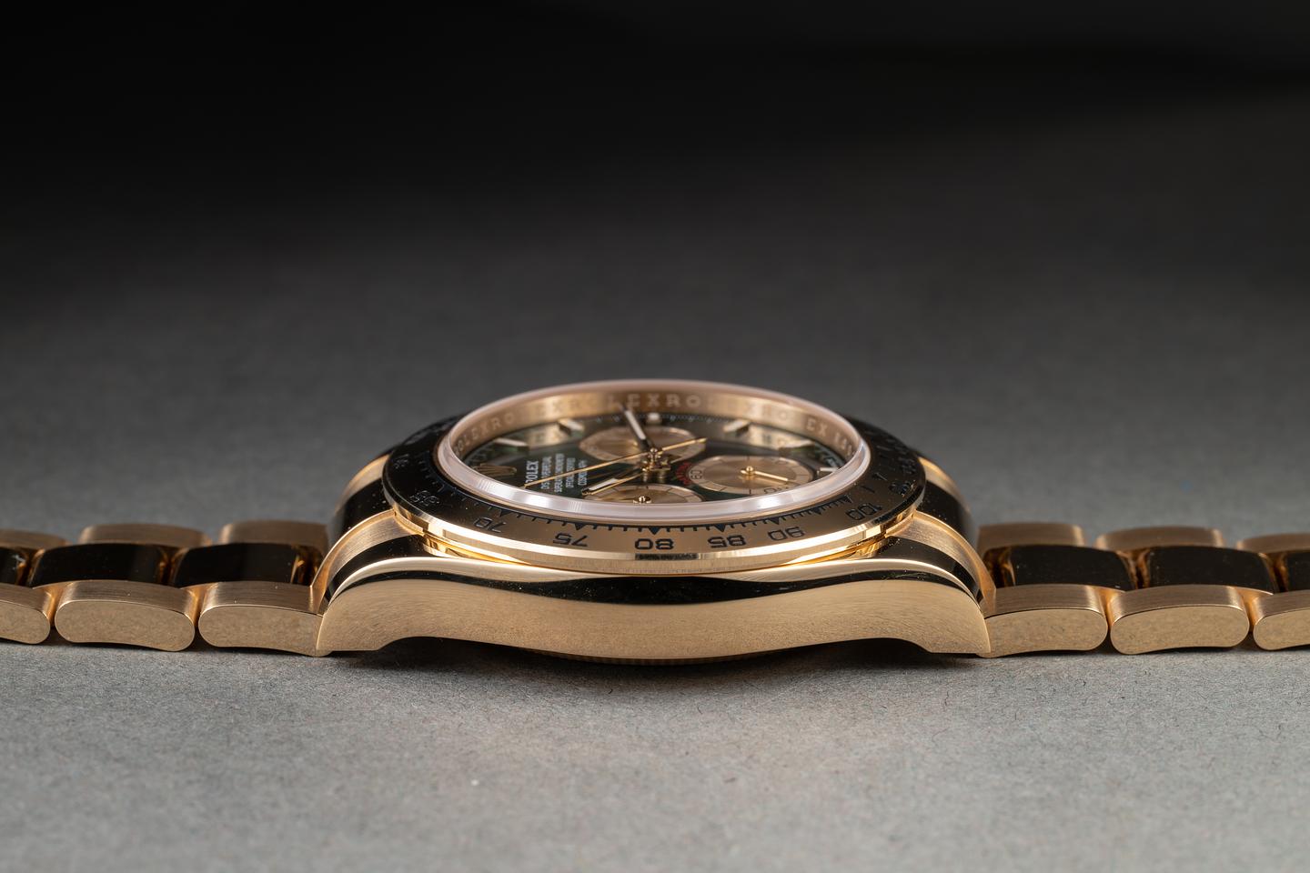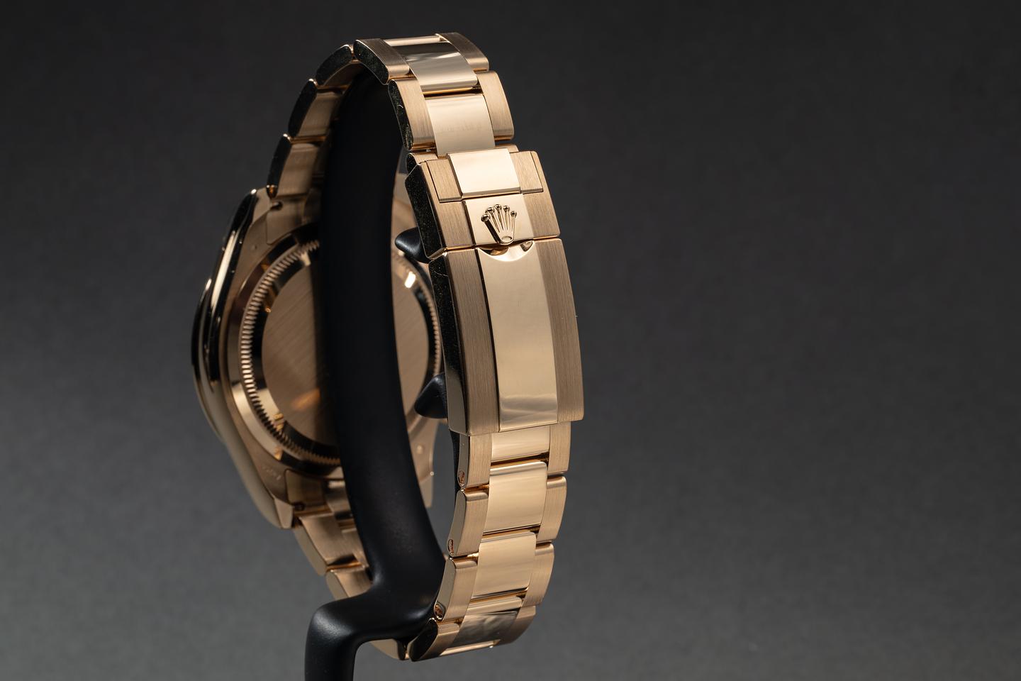 Bracelet: The 12-link 18K yellow gold oyster bracelet is mint.