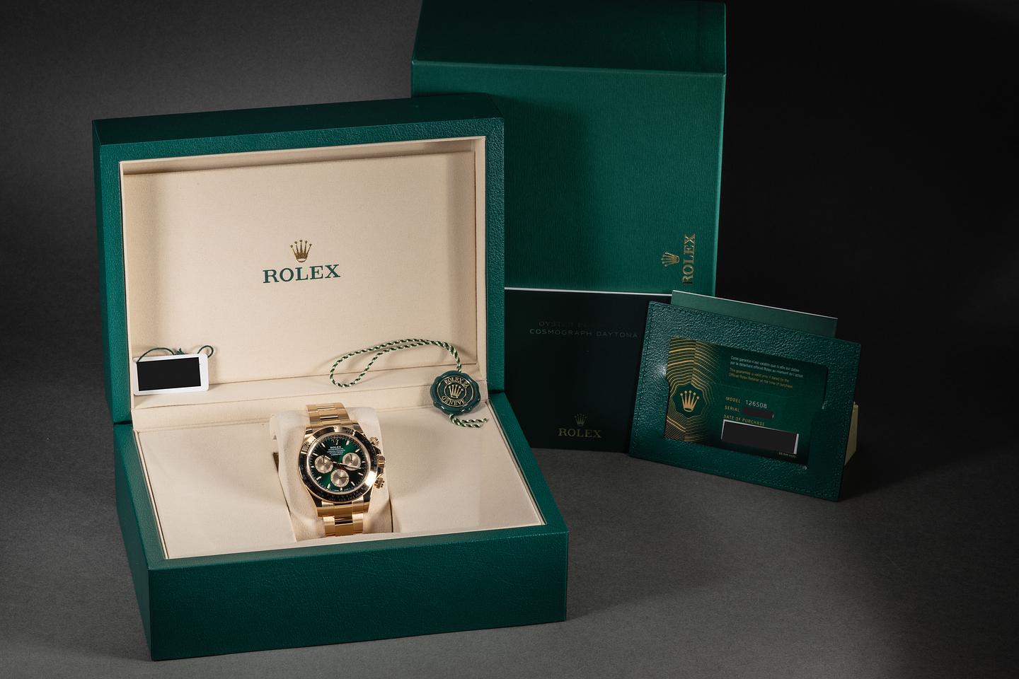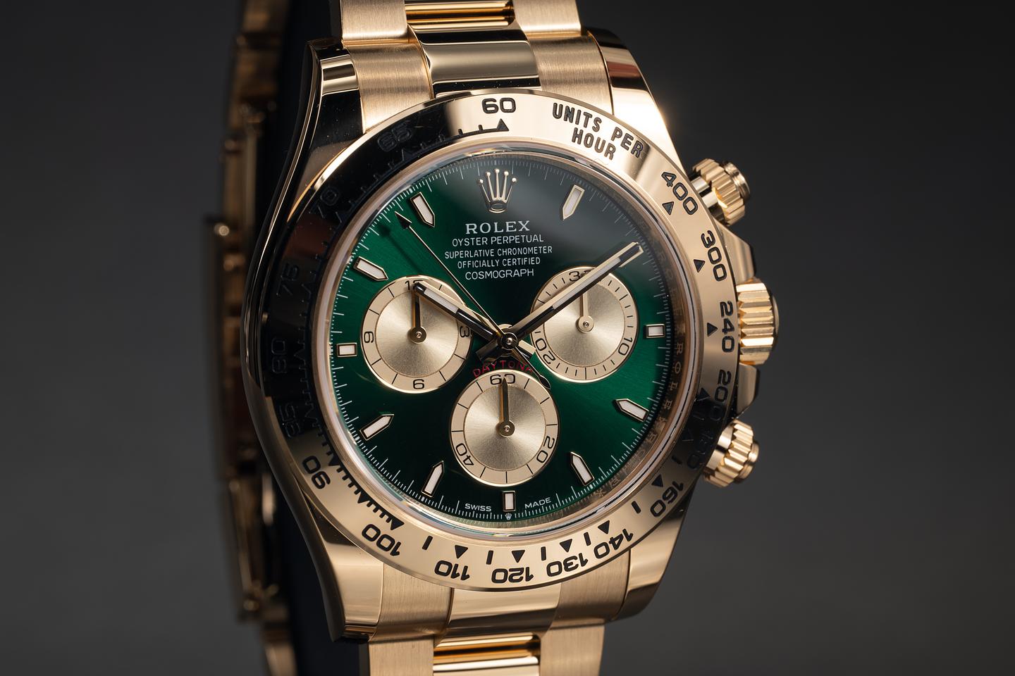Dial: The green and gold dial is mint, and the original factory hands are matching.