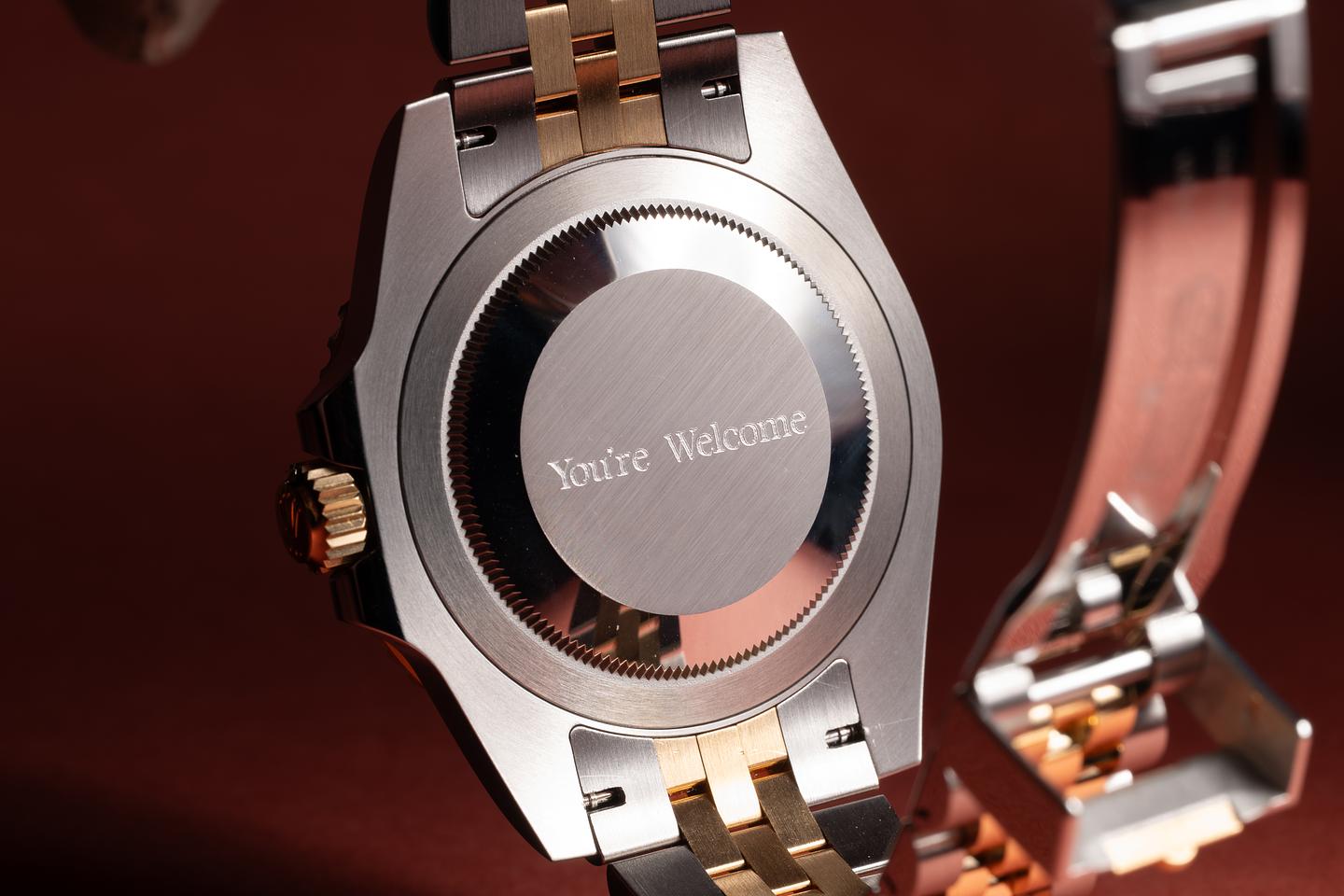 Case: The case is in near-mint, unworn condition. The black & grey ceramic bezel is mint, showing no visible wear. The case back has a personalized engraving that reads "You're Welcome"
