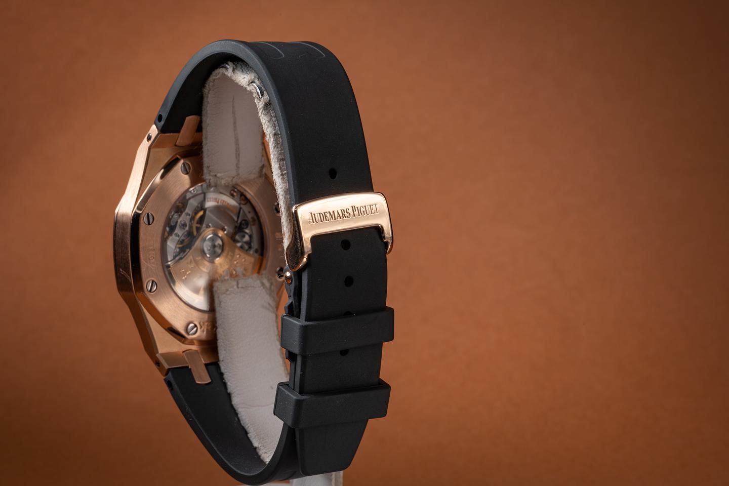 Bracelet: The black rubber strap is excellent showing only very light wear from use. The 18k rose gold clasp is also in excellent condition showing only very light wear from use.