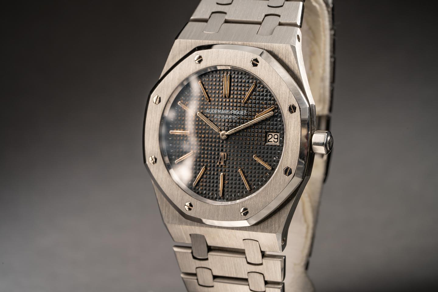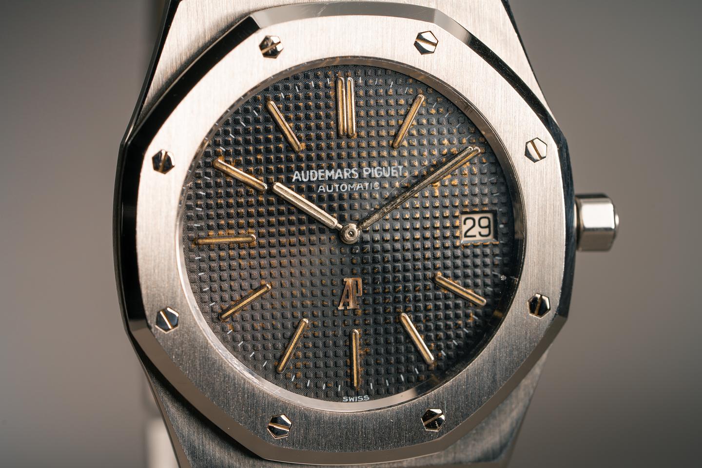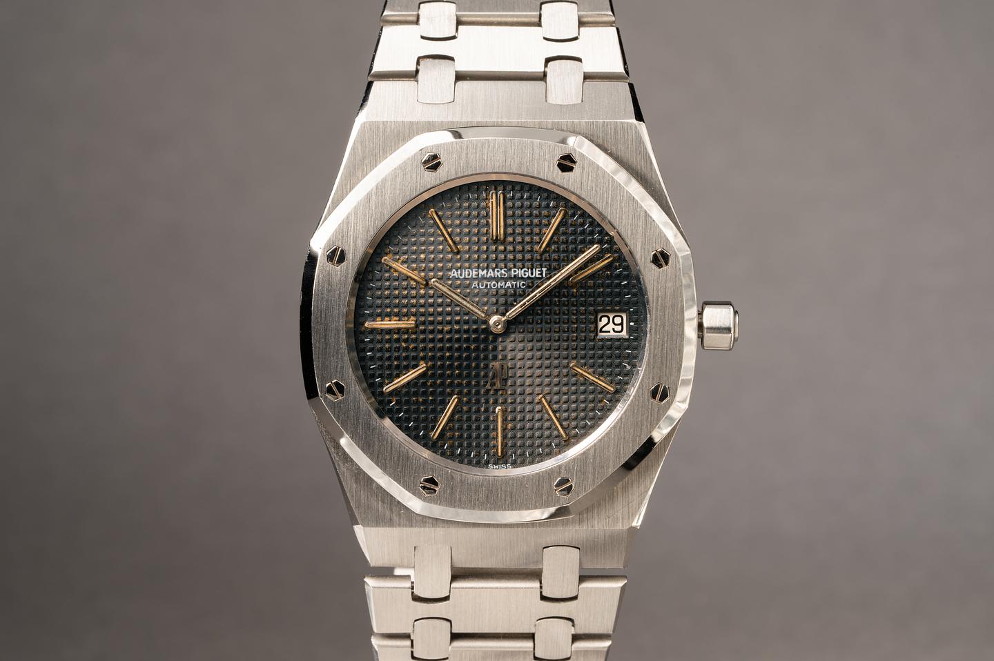 Notes: Beautiful amber hues show through the blue-grey dial on this fantastic vintage Royal Oak.