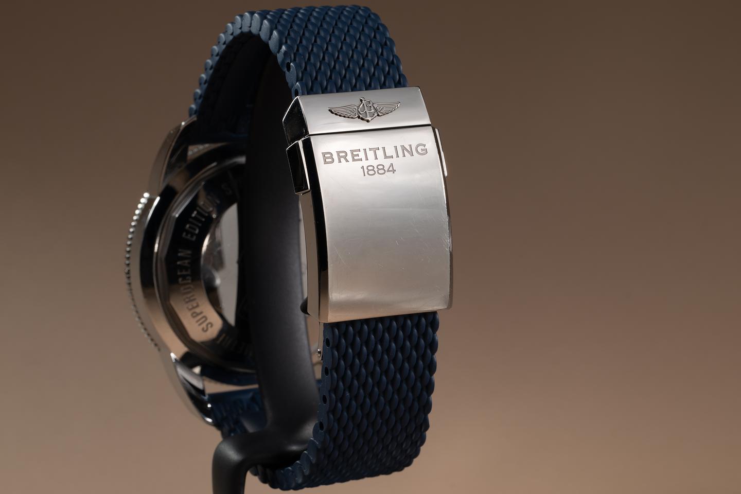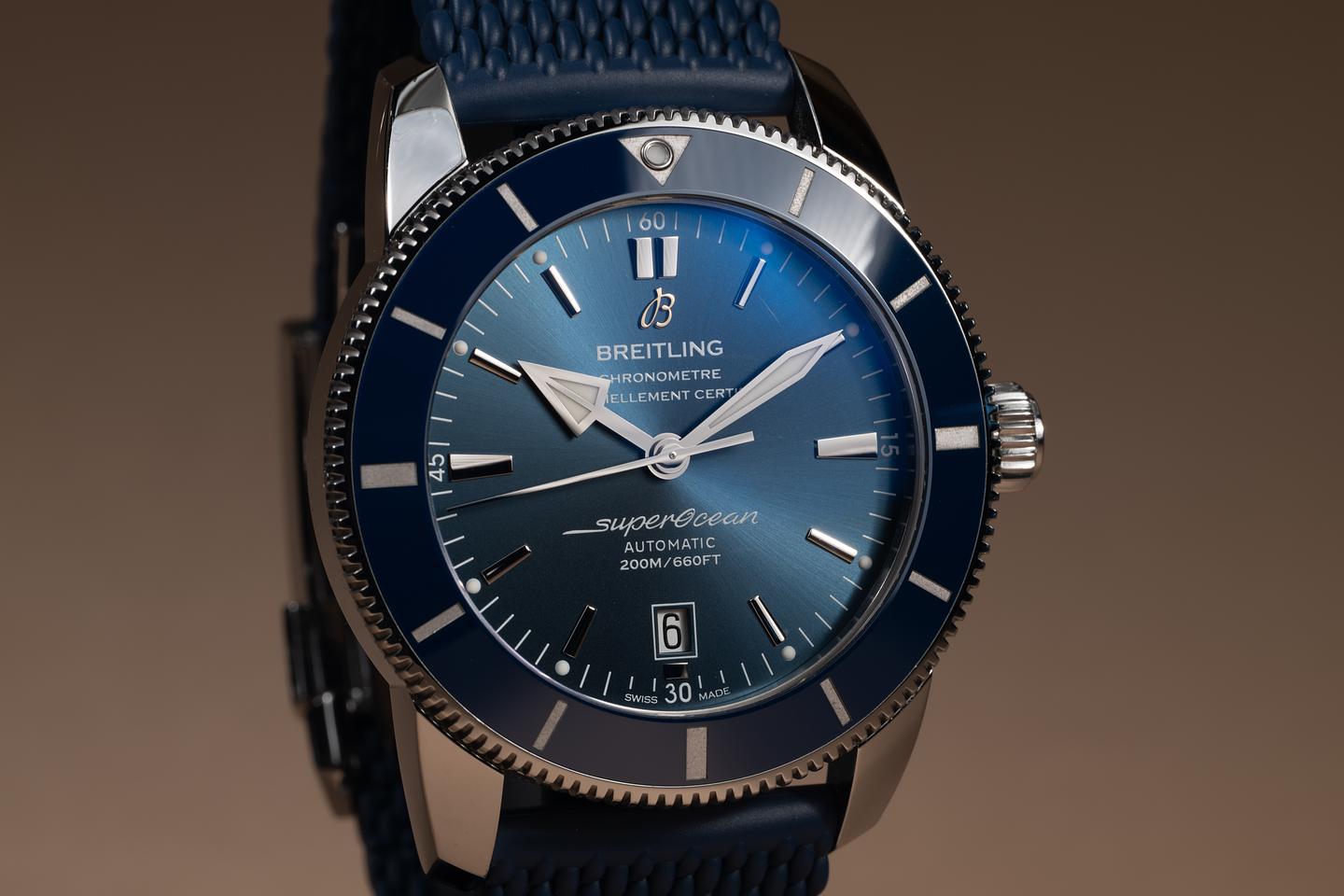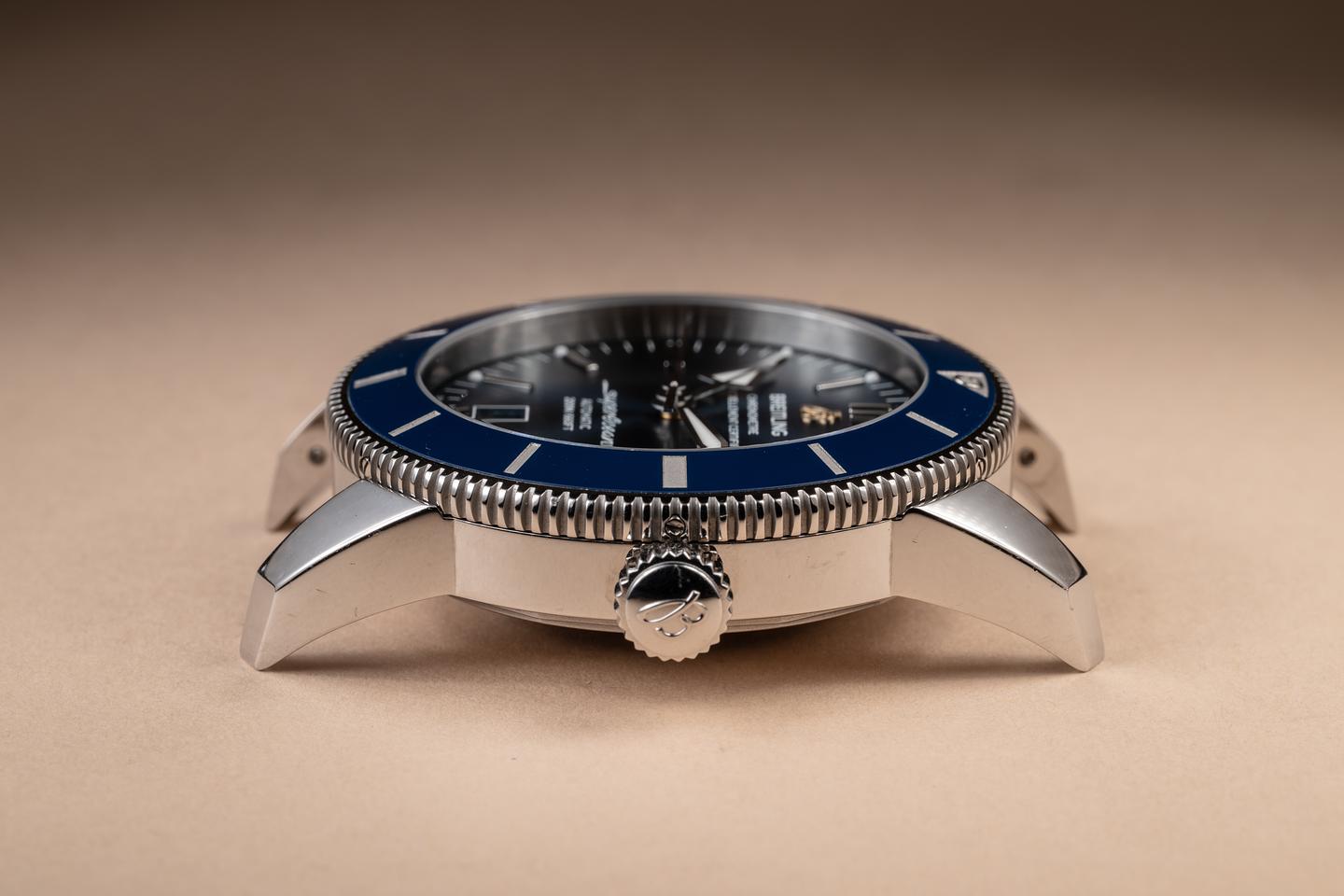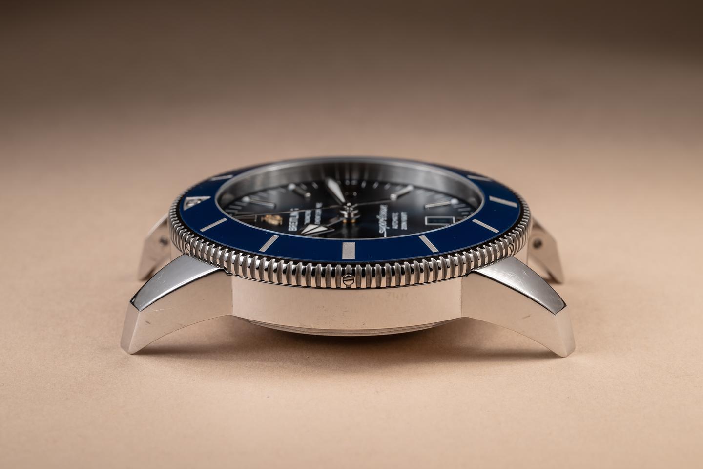 Case: The 46mm case is excellent, showing only extremely light wear. The blue ceramic bezel is also in excellent condition, showing only extremely light wear.