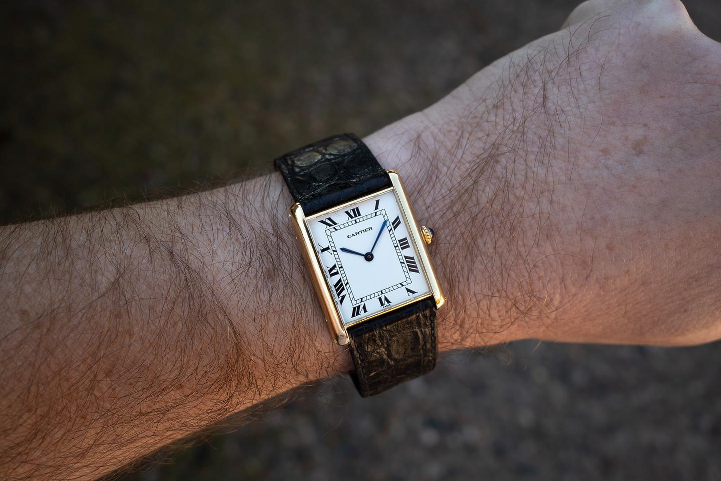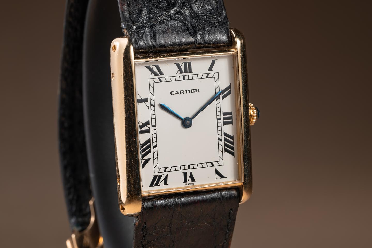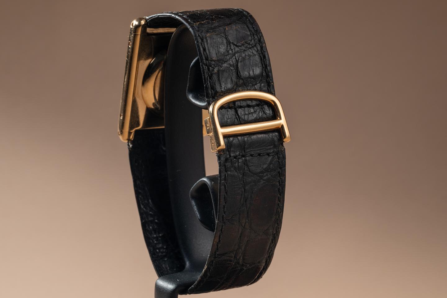 Bracelet: The black leather Cartier strap is very good, only showing natural wear. The 18k yellow gold Cartier buckle is excellent, showing only light wear from use. The leather strap will fit a wrist size up to 6.5 inches.