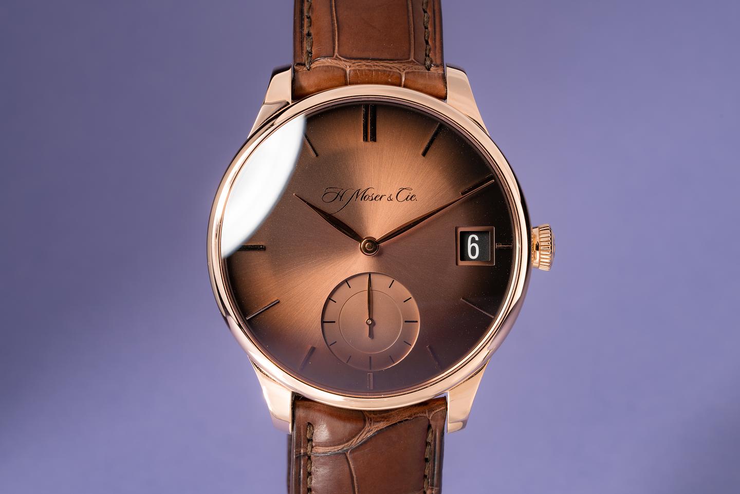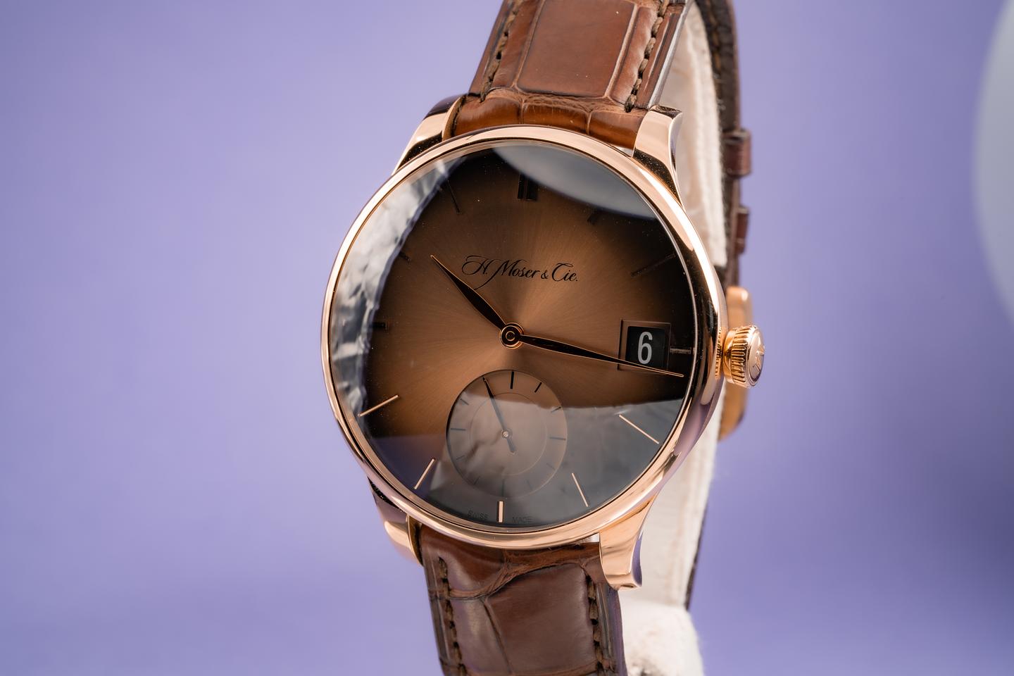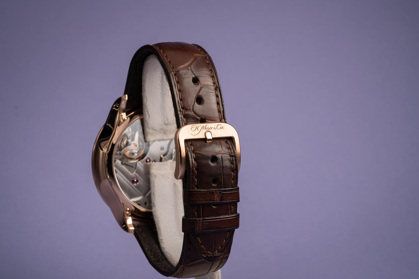 Bracelet: Excellent H. Moser & Cie. brown alligator strap and matching 18k rose gold buckle.