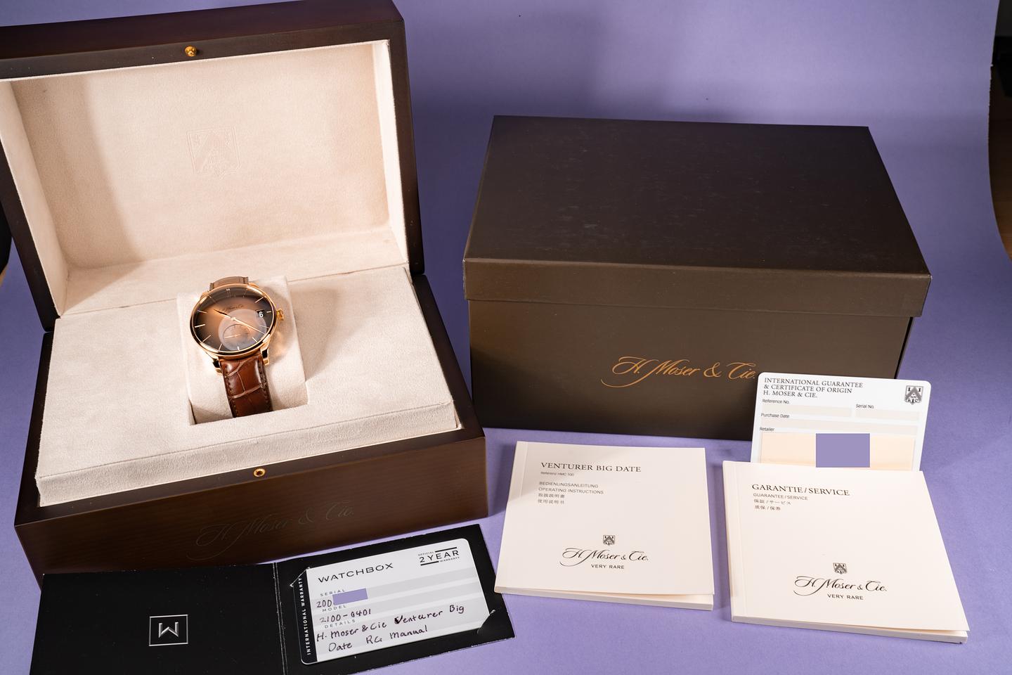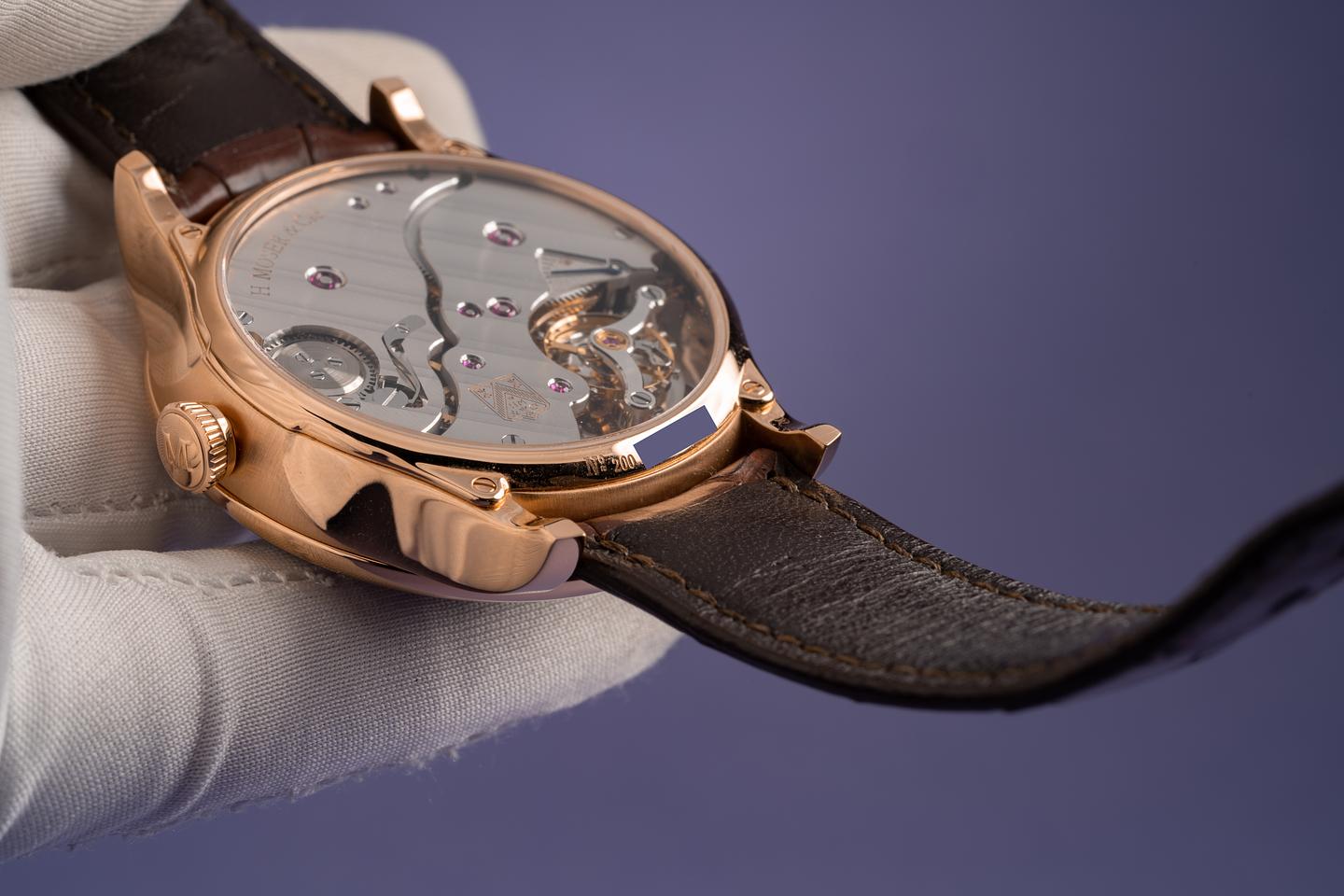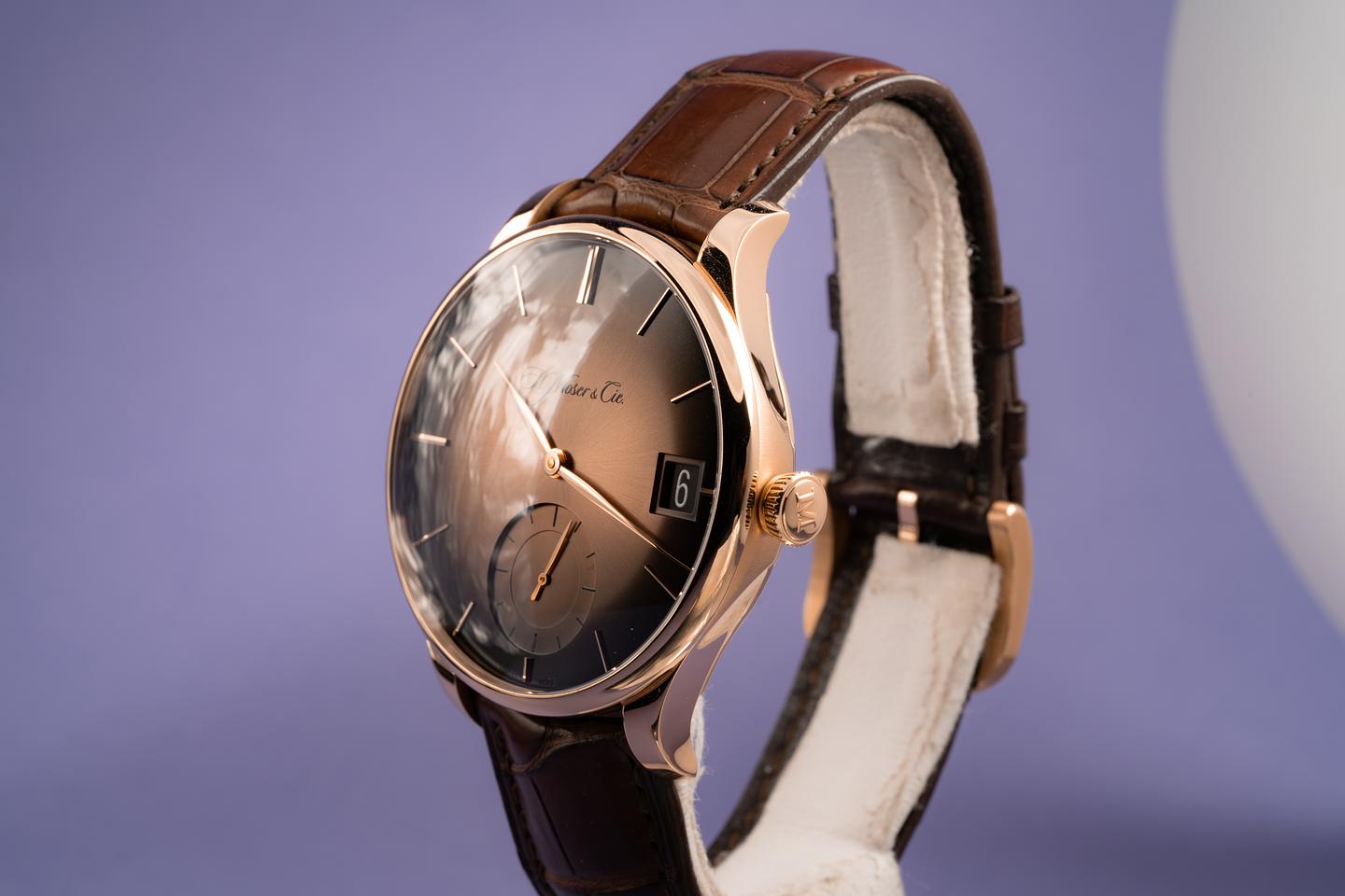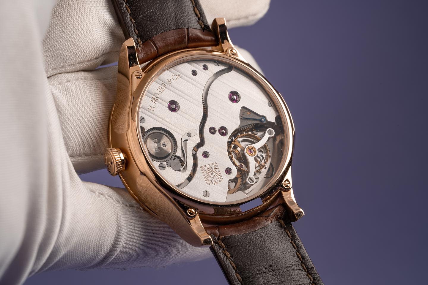 Bracelet: Excellent H. Moser & Cie. brown alligator strap and matching 18k rose gold buckle.