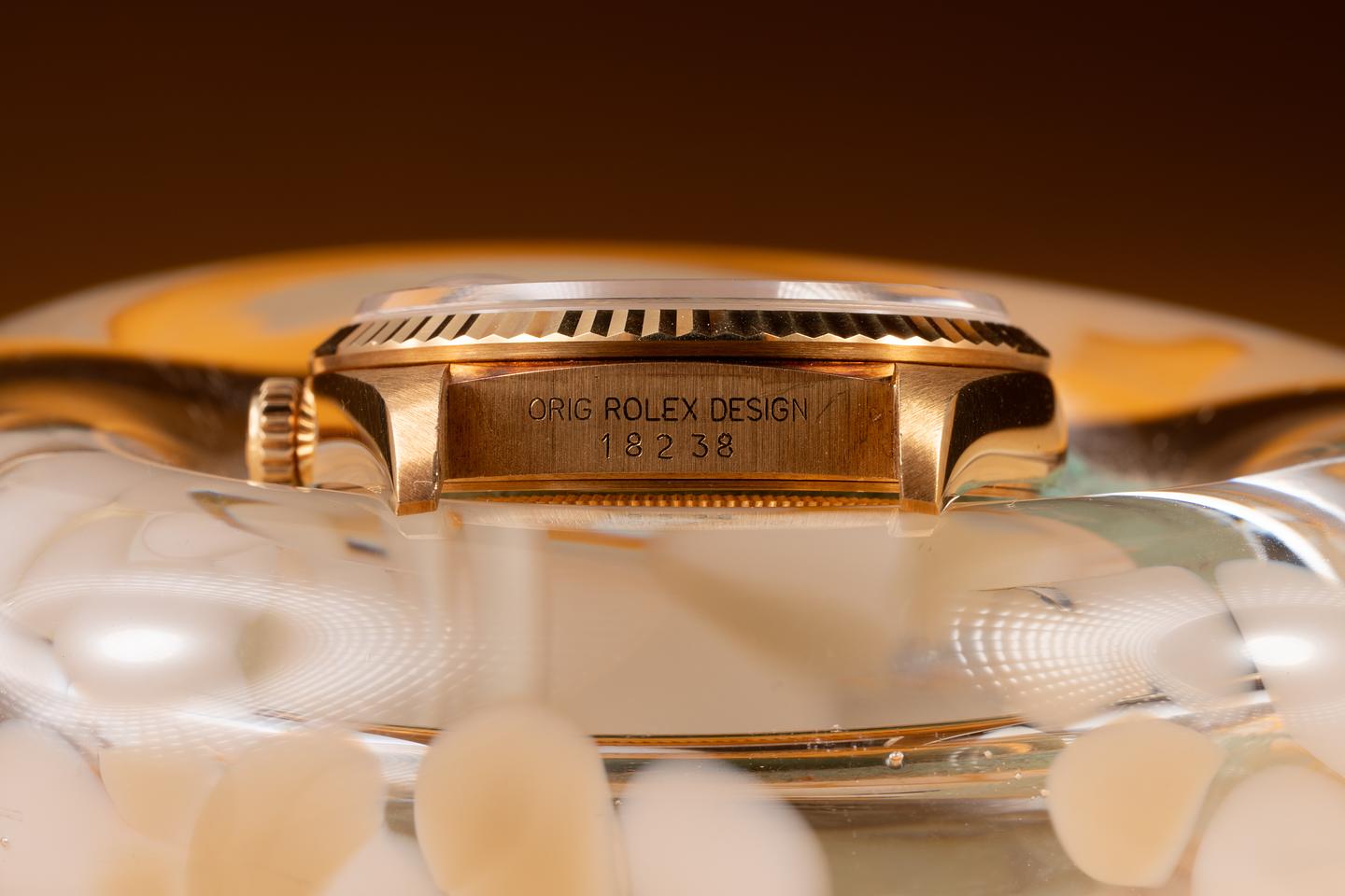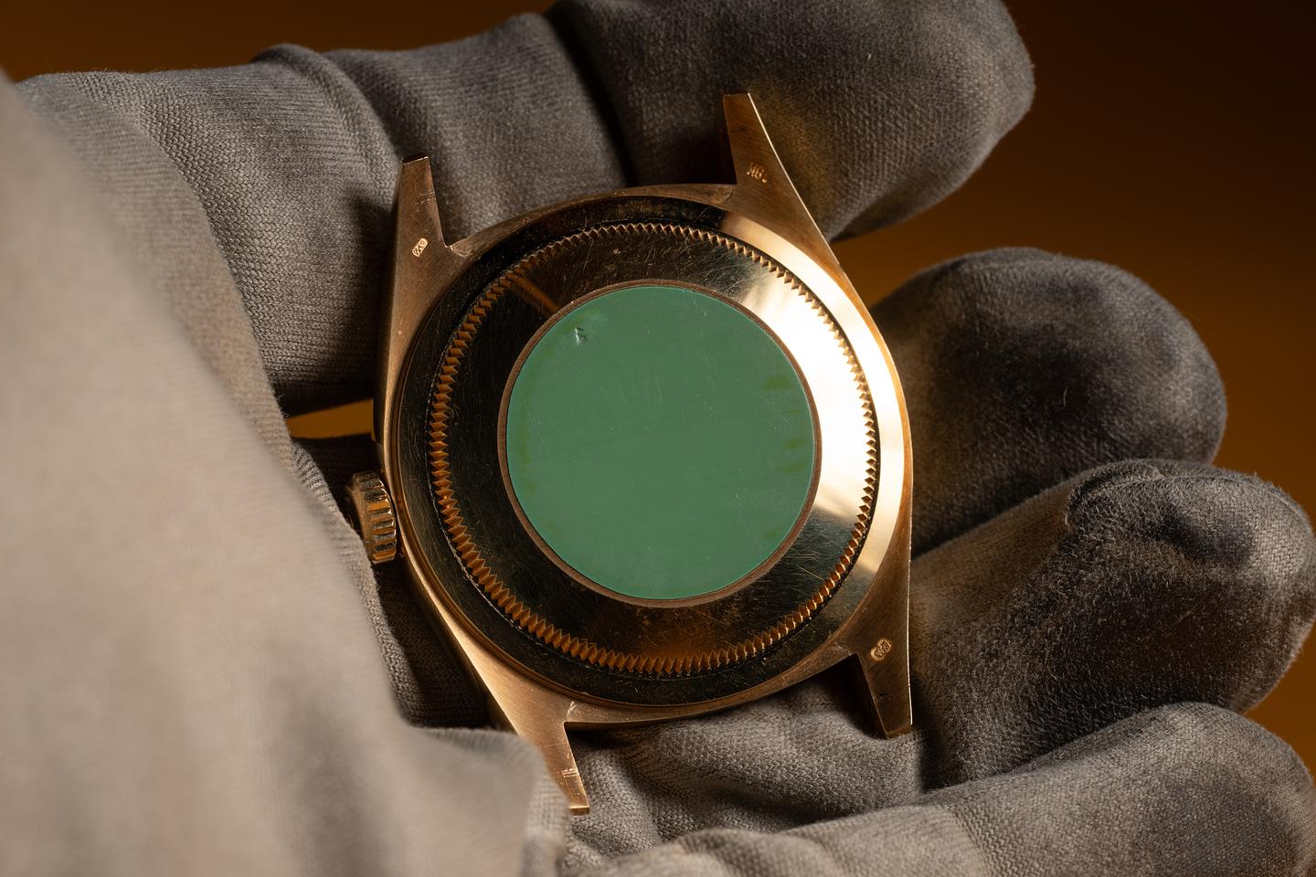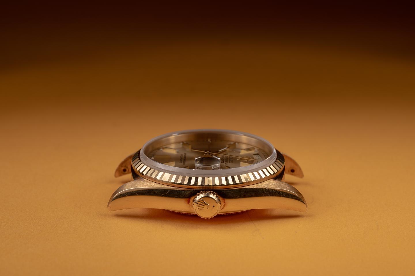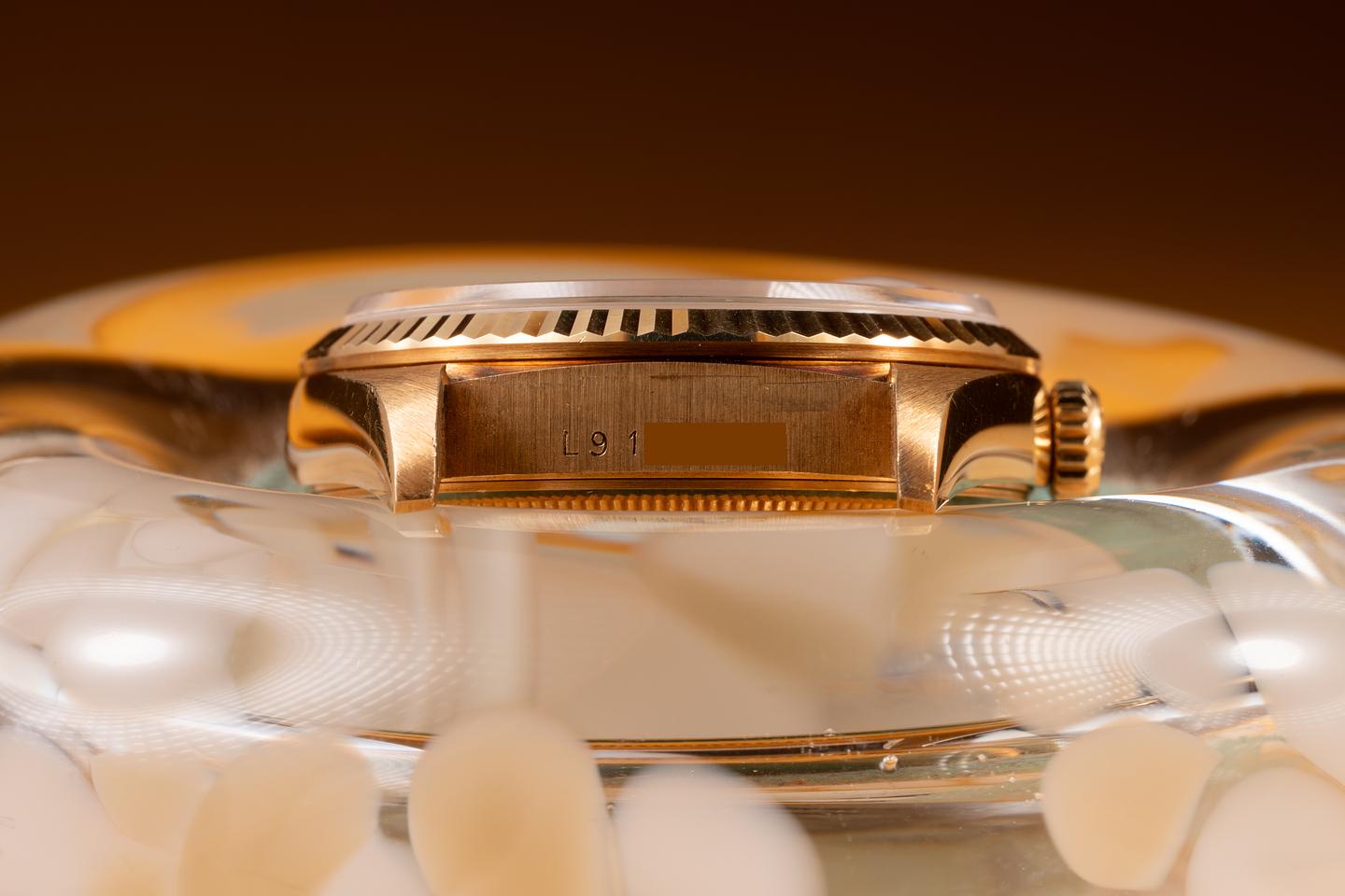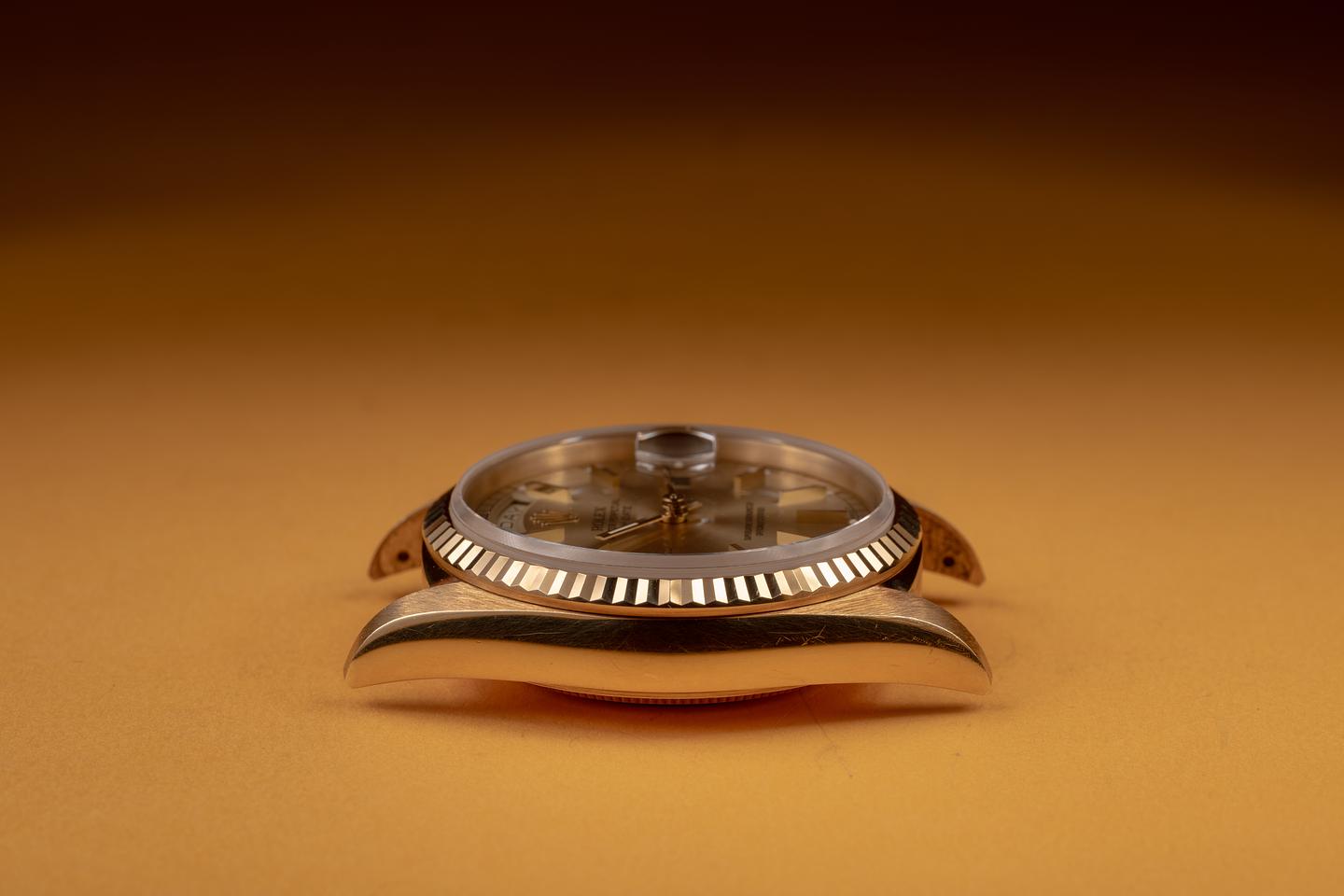 Case: The 18K yellow gold case is in unworn, new old stock condition, showing a warm, rosy patina and only extremely light wear. The sharp 18K yellow gold fluted bezel is also in unworn, new old stock condition, showing a warm, rosy patina and only extremely light wear.