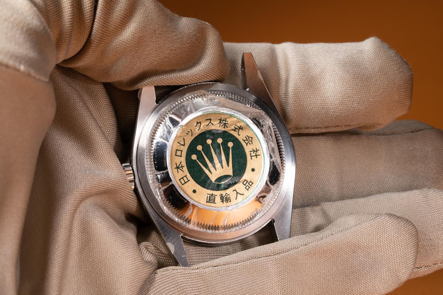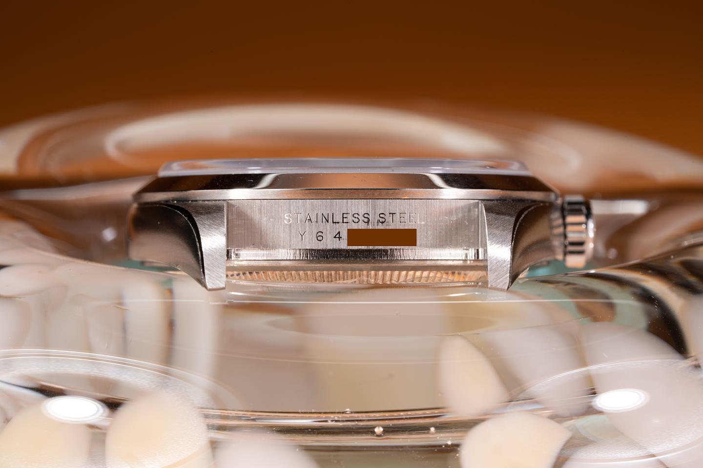 Case: The new old stock case is mint with the factory protective stickers still in place. The smooth stainless bezel insert is also mint showing no wear.