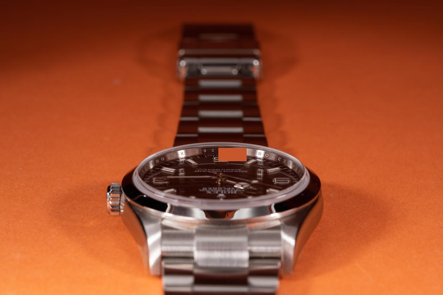 Case: The unpolished case is excellent showing only extremely light shop wear. The factory protective stickers are still in place on the side of the case. There is a Administración Federal de Ingresos Públicos stamp on the caseback