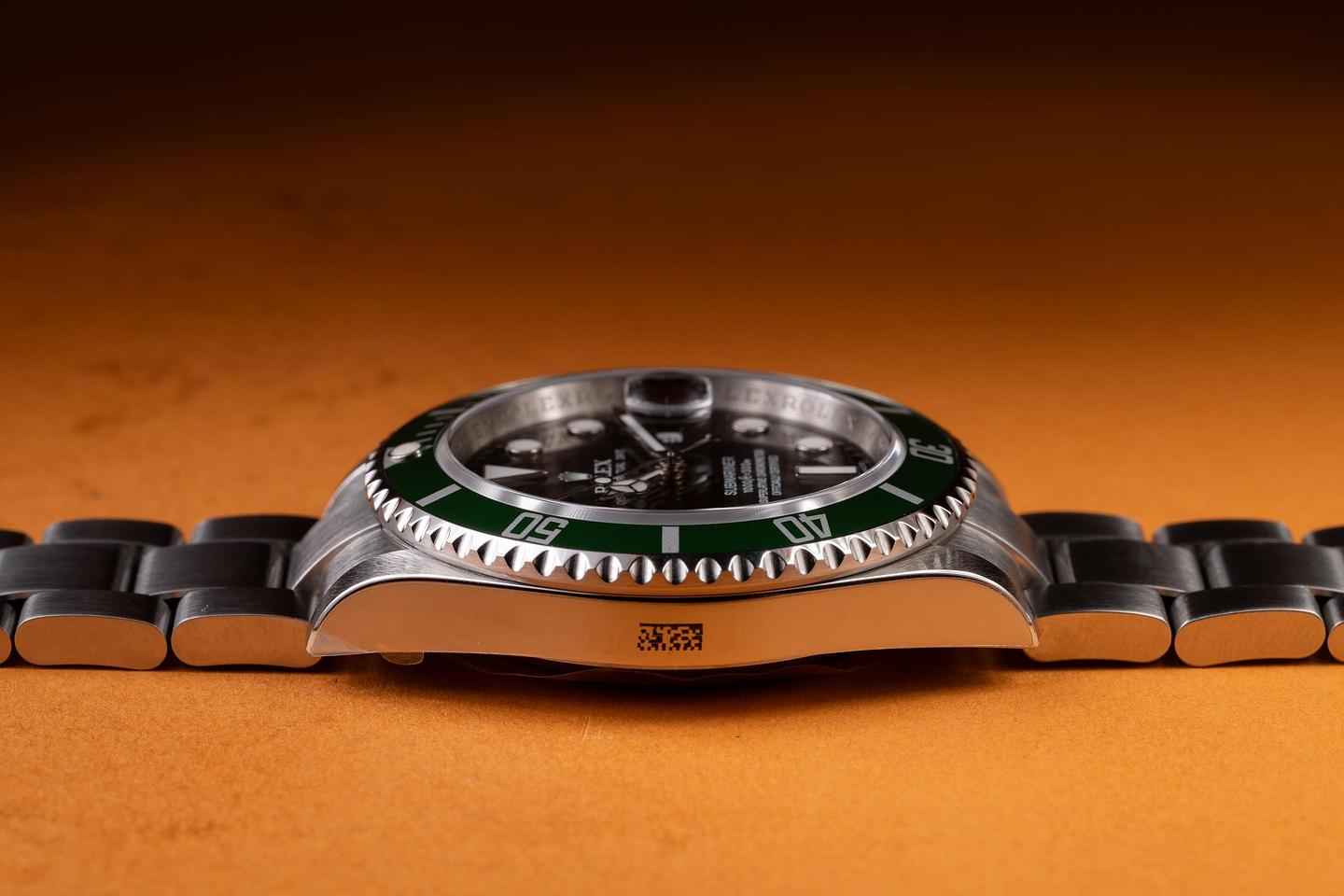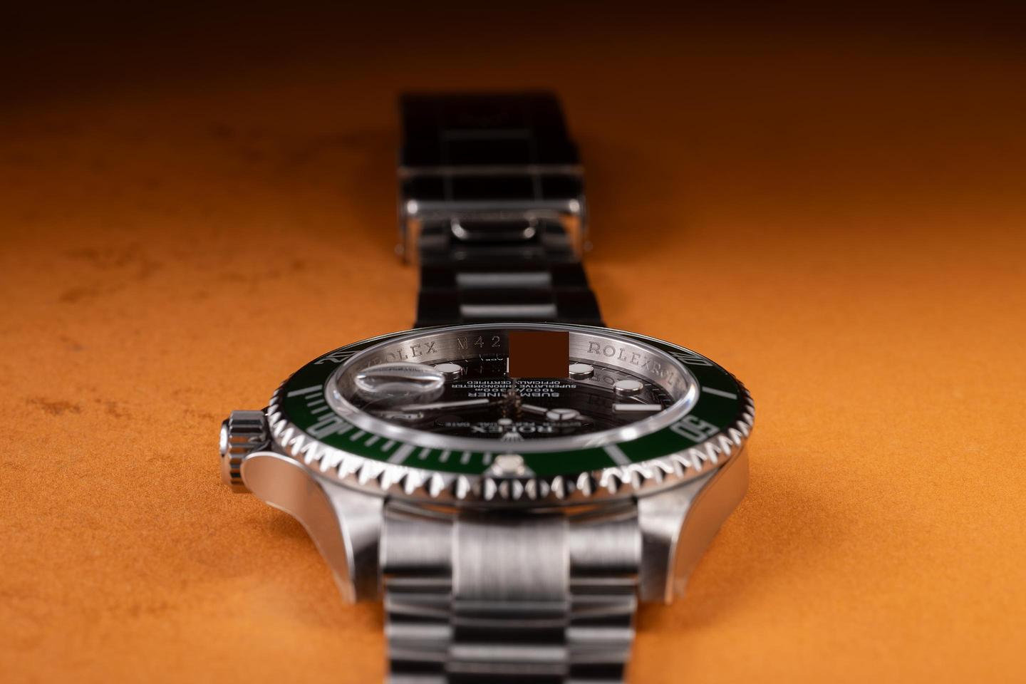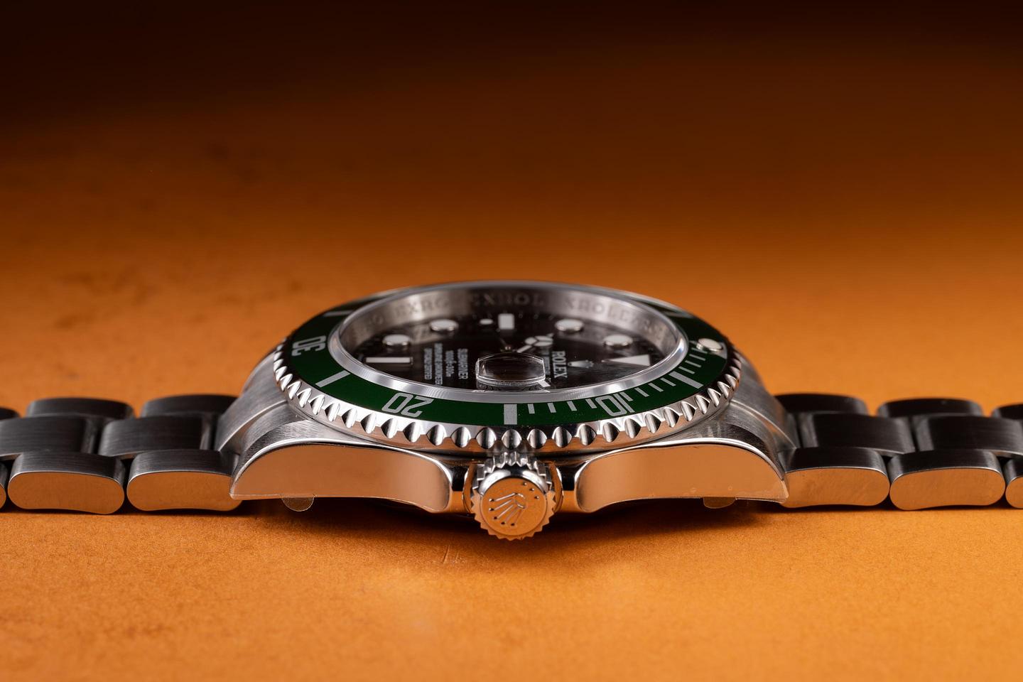 Case: The case is in mint, unworn condition with the factory protective stickers still in place. The green bezel insert is also in mint, unworn condition.