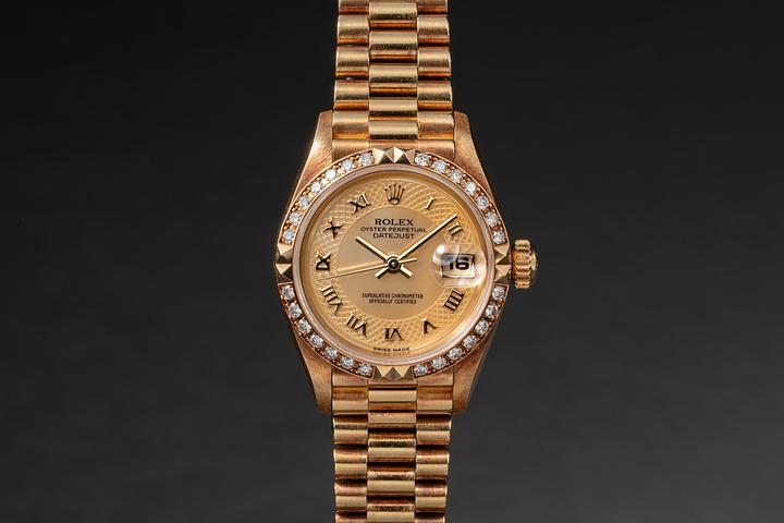 1996 Rolex 18K YG Ladies Diamond Pyramid DateJust 69178 Guilloché MOP Dial