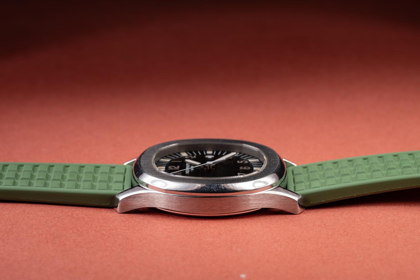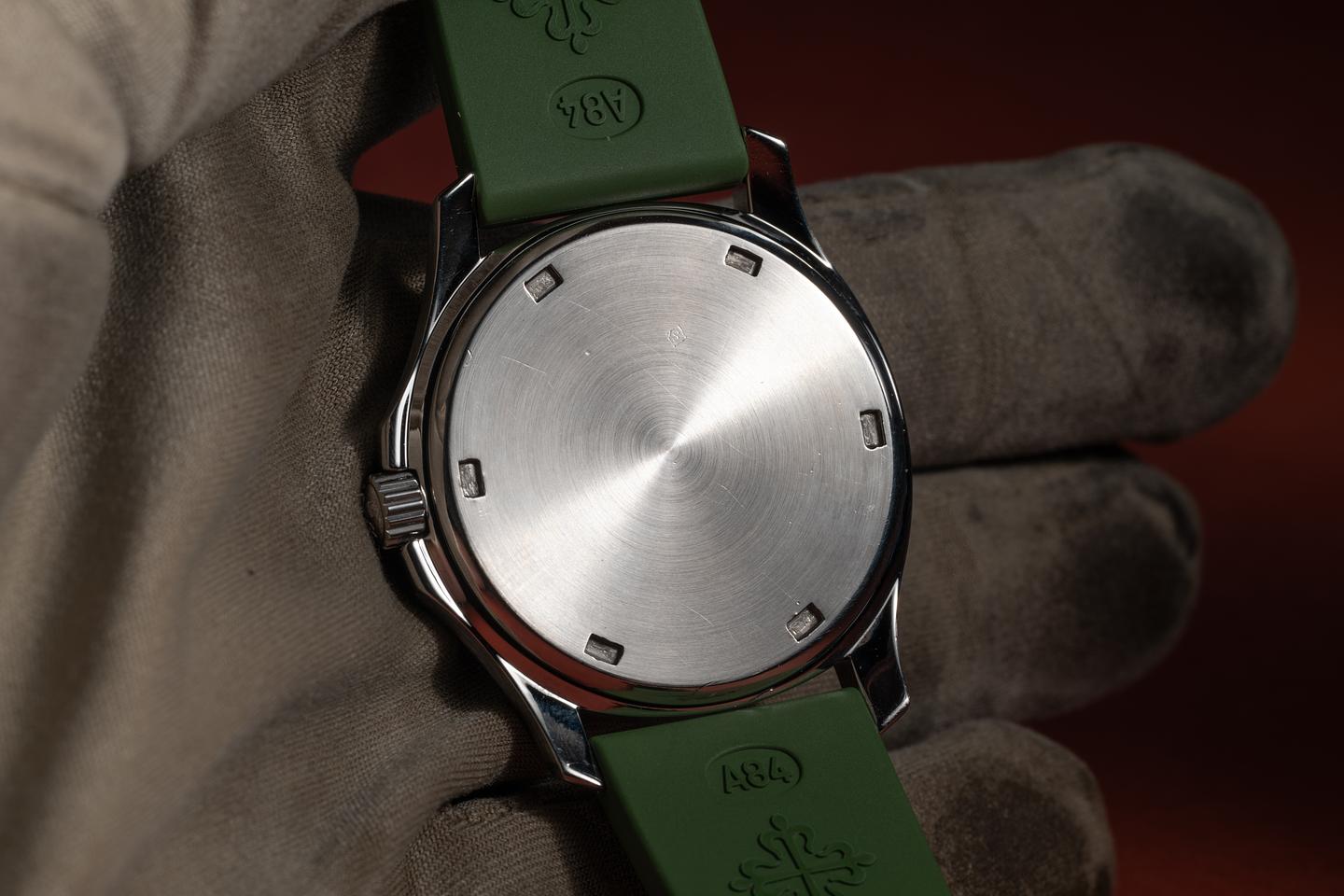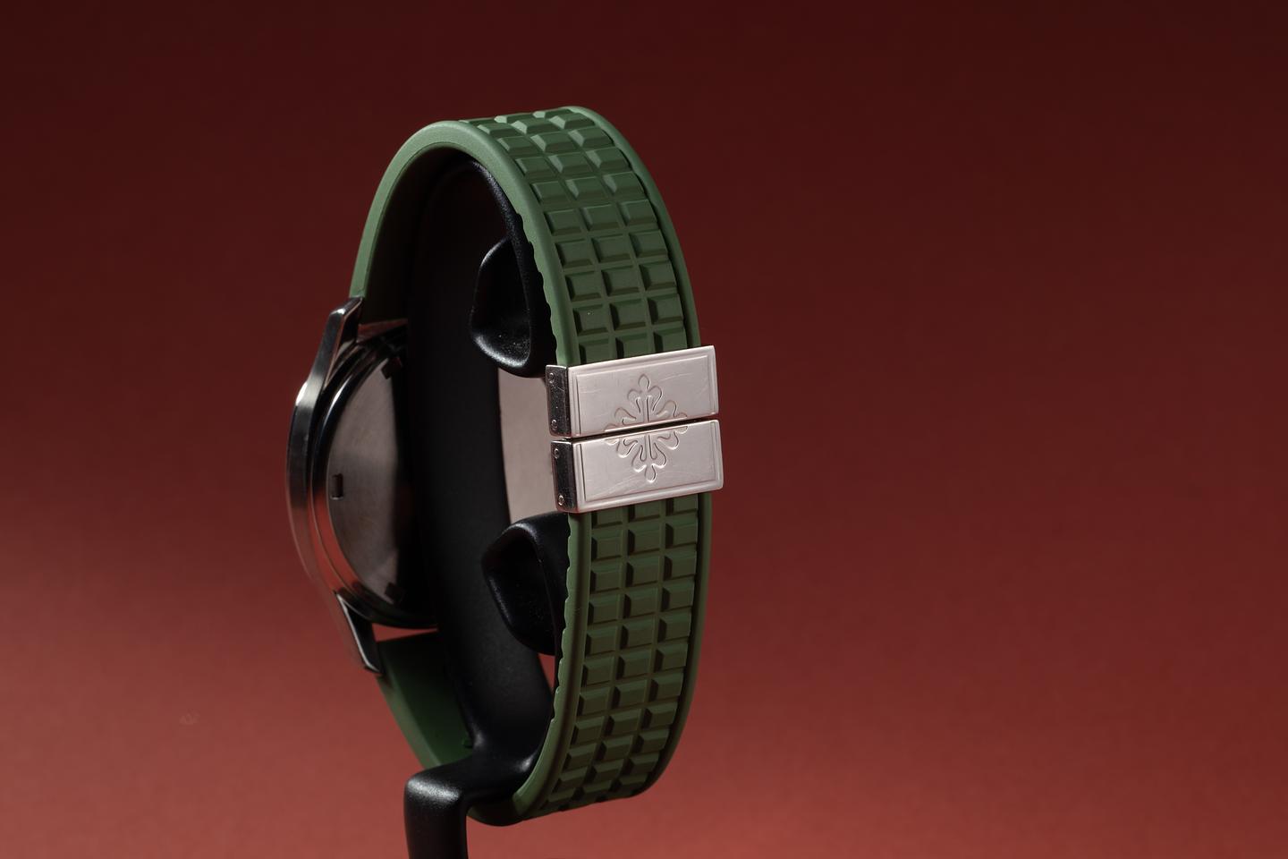 Bracelet: The green Patek strap is excellent, showing only very light wear from use. The stainless Patek clasp is also in excellent condition, showing some light wear from use. The strap will fit up to a 6.25" (15.9cm) wrist.