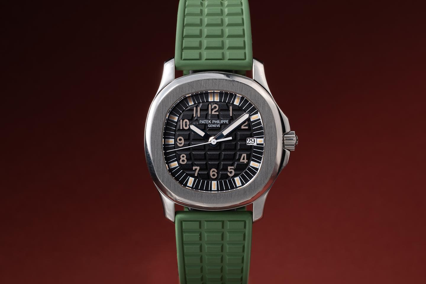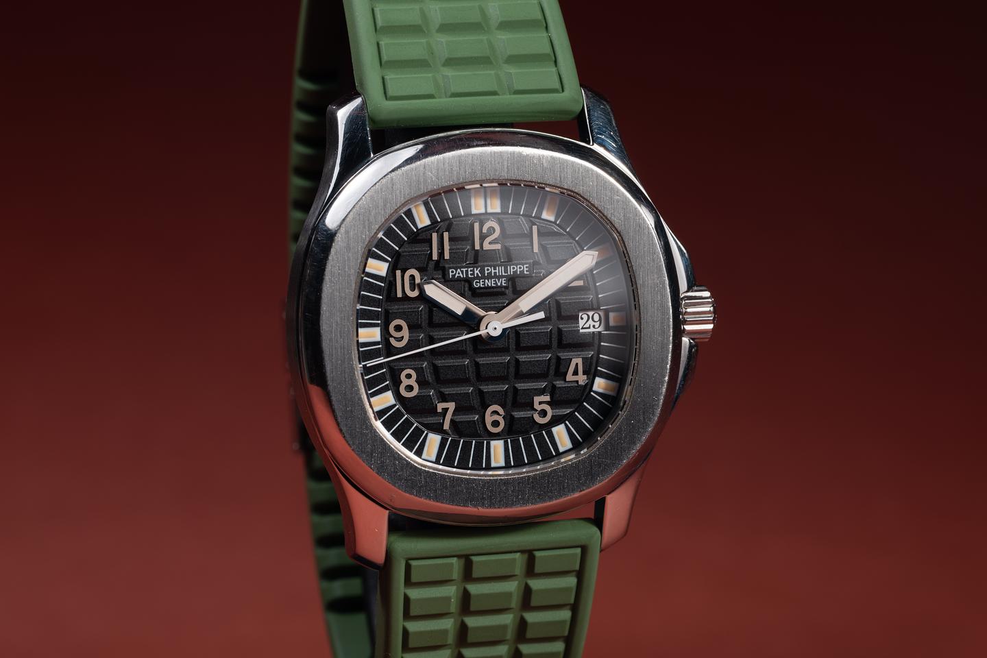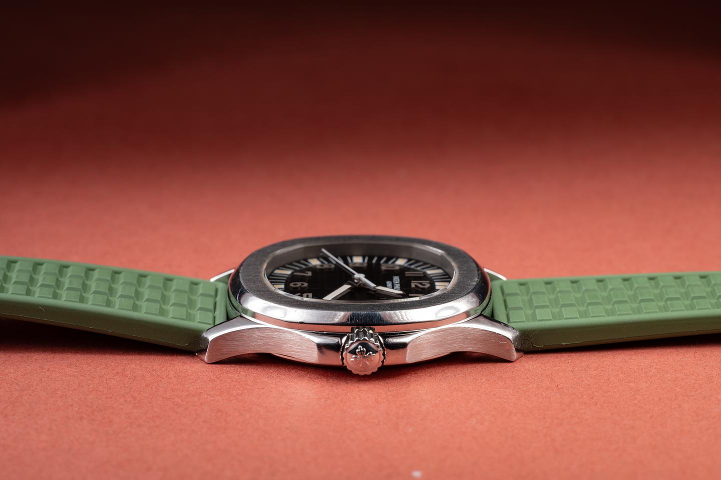 Bracelet: The green Patek strap is excellent, showing only very light wear from use. The stainless Patek clasp is also in excellent condition, showing some light wear from use. The strap will fit up to a 6.25" (15.9cm) wrist.