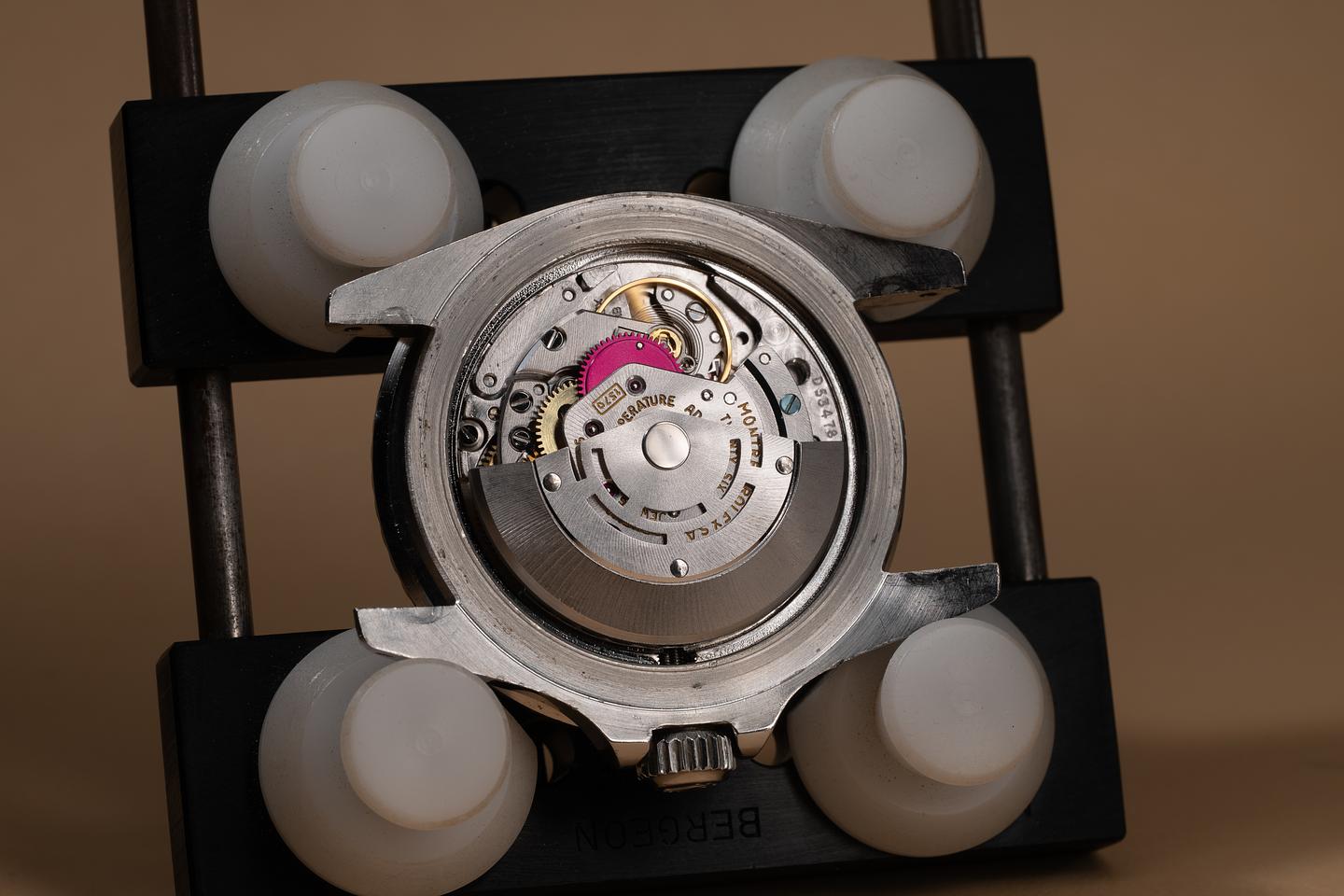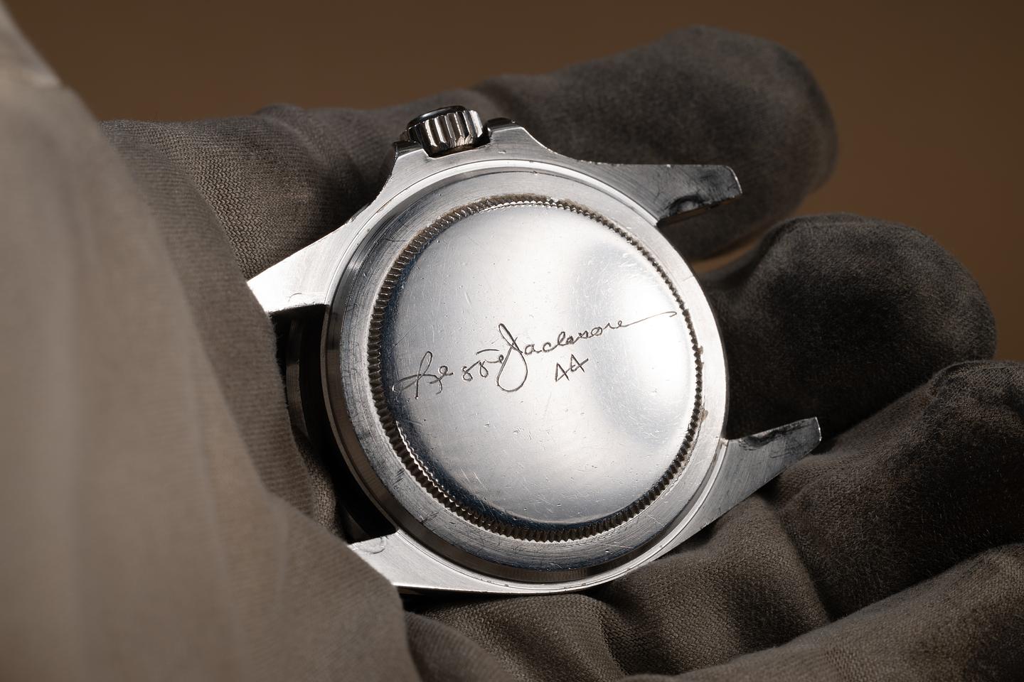 Case: The unpolished case is excellent, showing prominent factory bevels, and some light wear from use. The bezel insert has aged to a silvery blue tone showing only light wear from use. The casdeback is engraved with Reggie Jackson's signature and number.