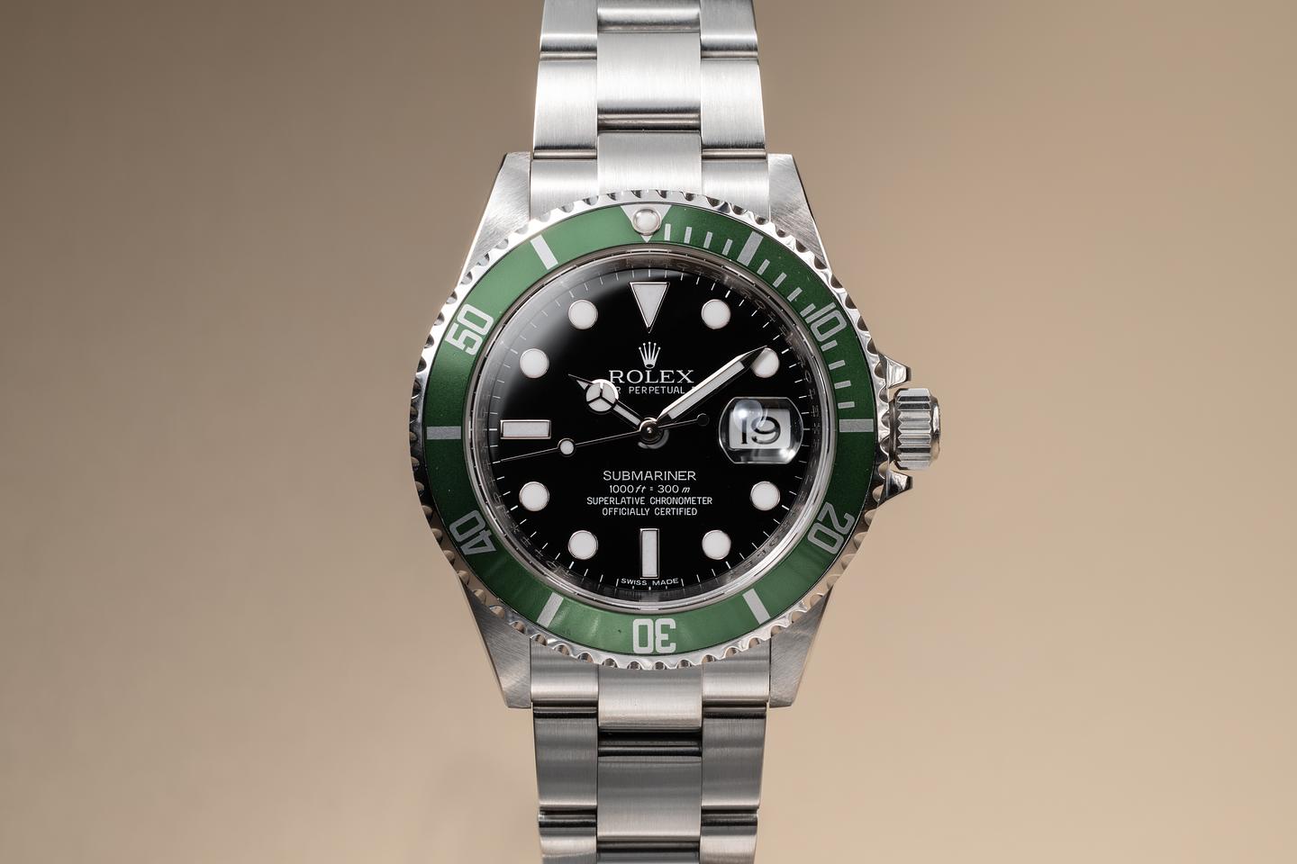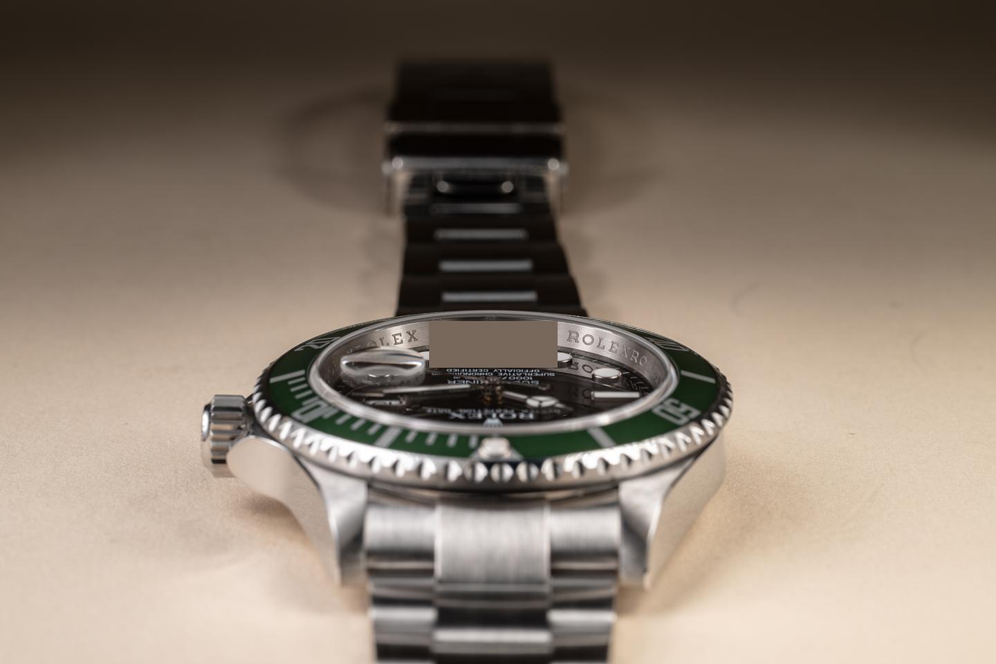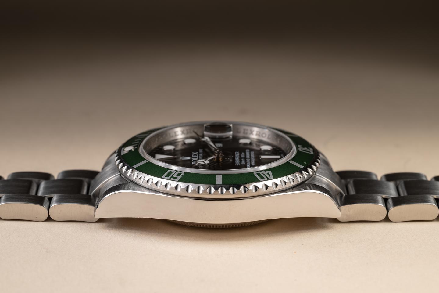 Case: The thick, even case is excellent, showing sharp, prominent bevels and only very light wear. The green bezel insert is also in excellent condition, showing only very light wear from use.