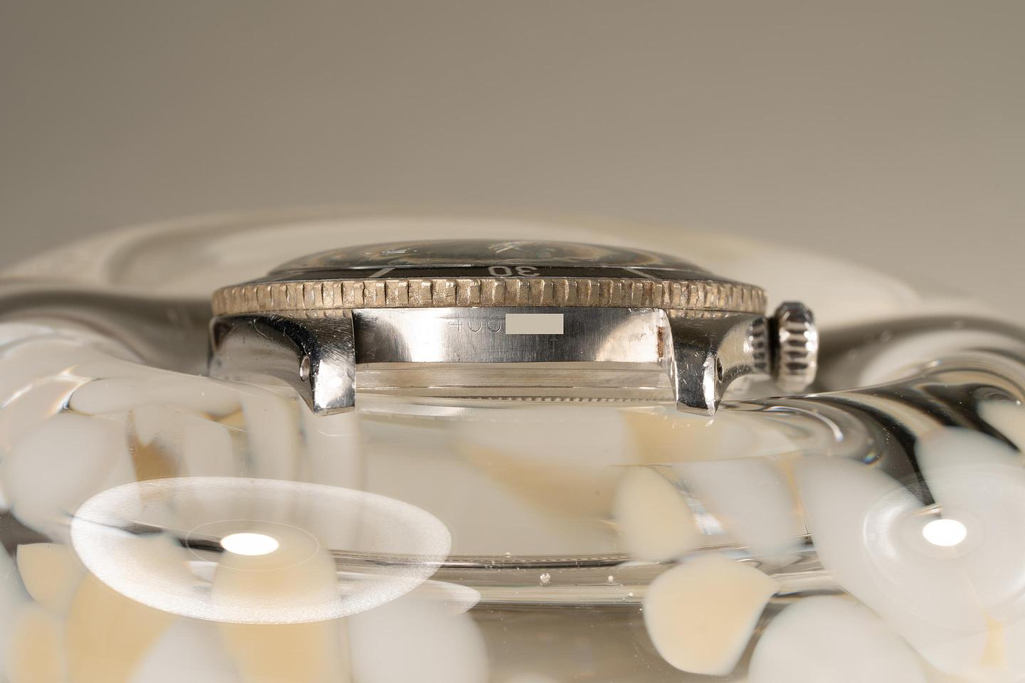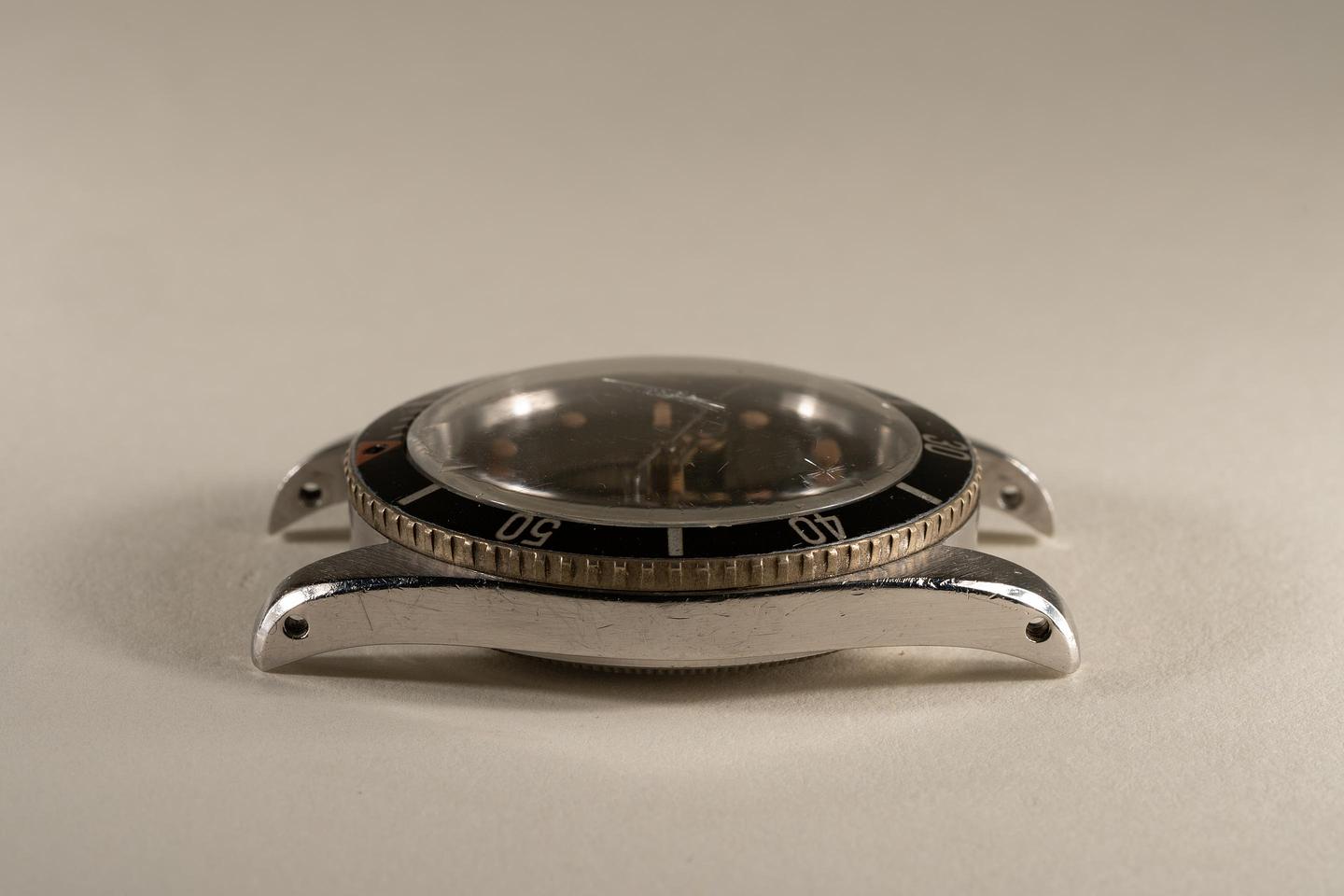 Case: Excellent case with thick prominent bevels shows a semi sleeve polished appearance. The black bezel insert is also in excellent condition and shows very light wear for its age. The red triangle is still bright and has faded only lightly over the years. The outer caseback is stamped "Stainless Steel".